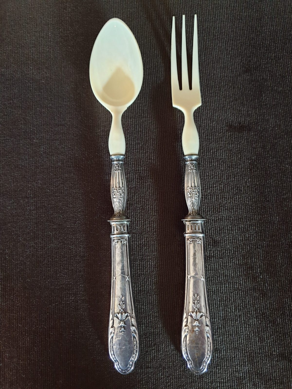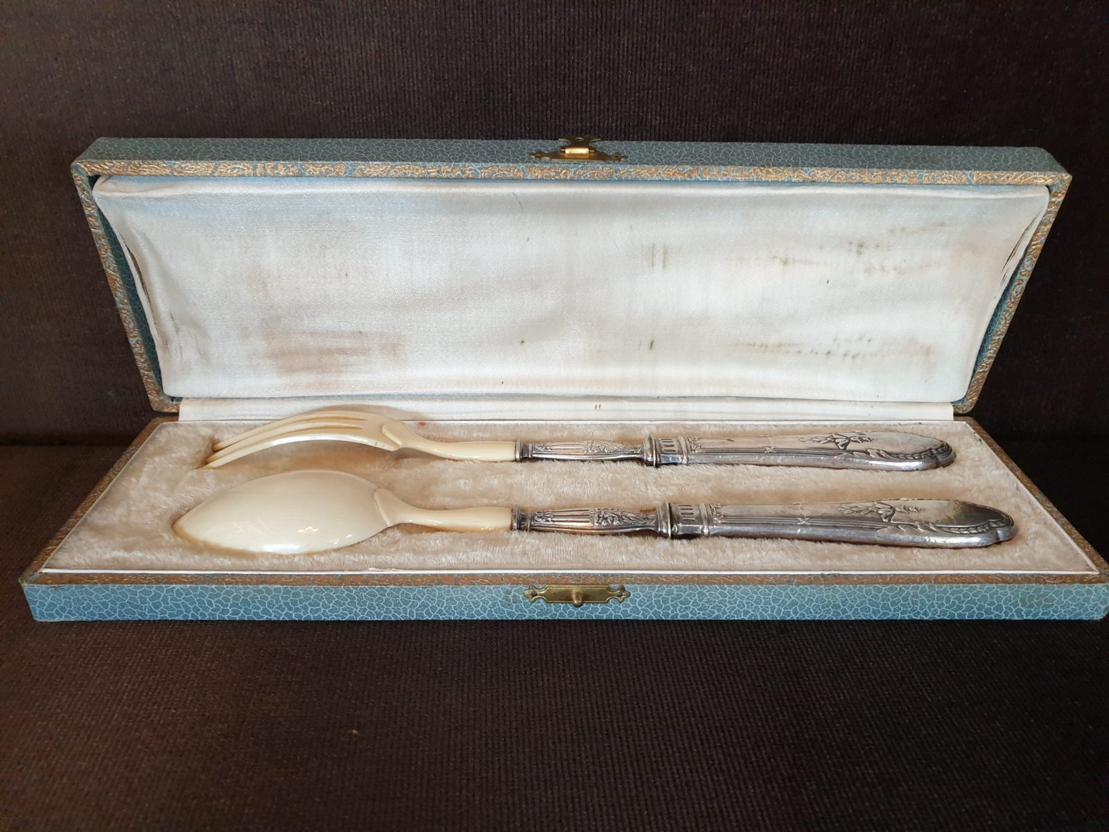 Service à salade modèle Ruban Christofle, boite verte, plastique et argent, 1 fourchette et 1 cuillère à servir