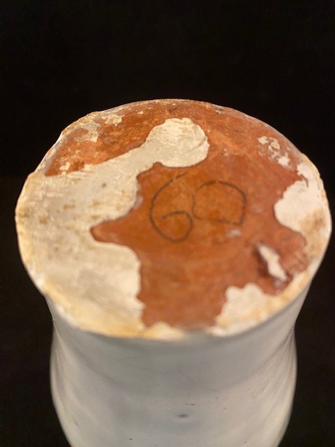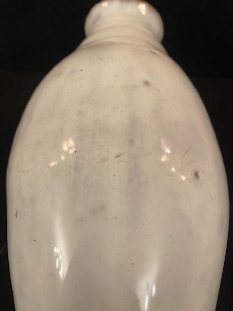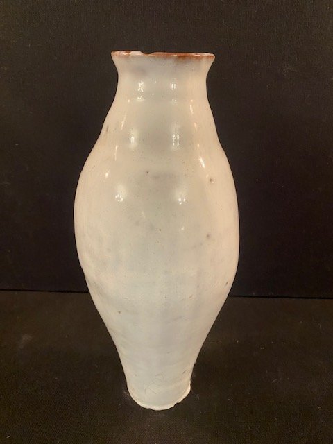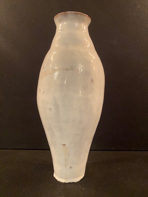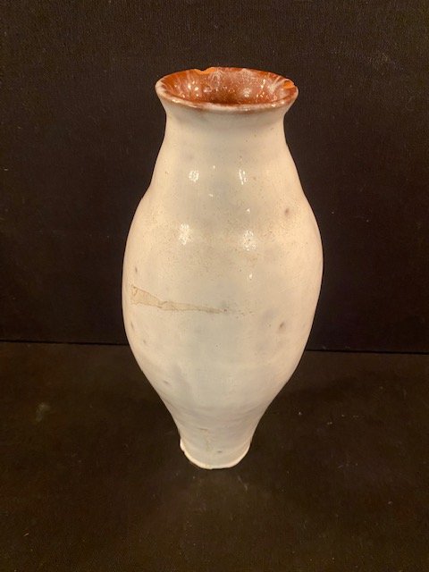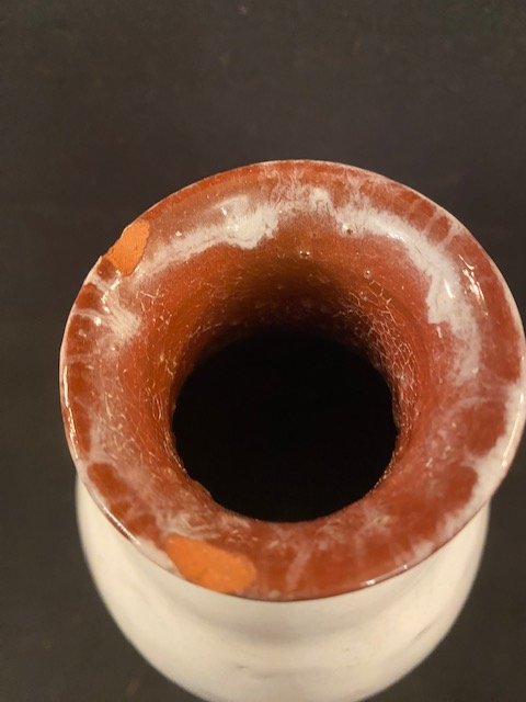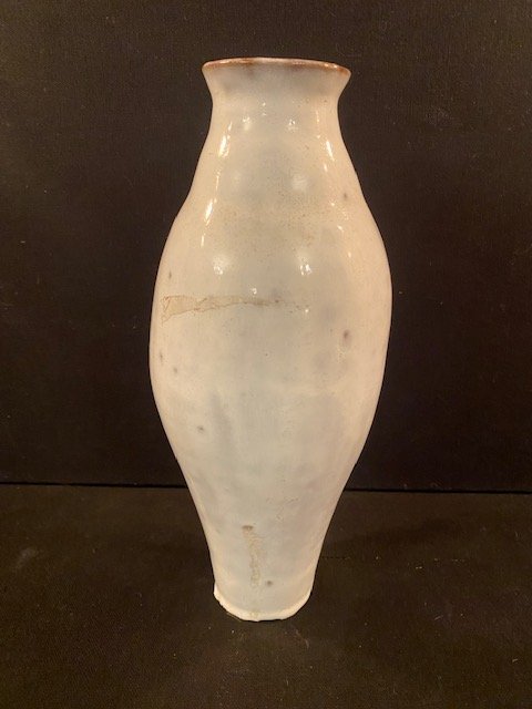 54-Vase en terre cuite émaillée blanc, 2 éclats sur le col, H25 x DH5,5 x DB5 x D11, Prix 10€