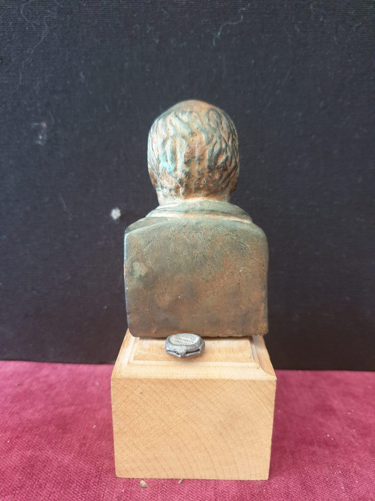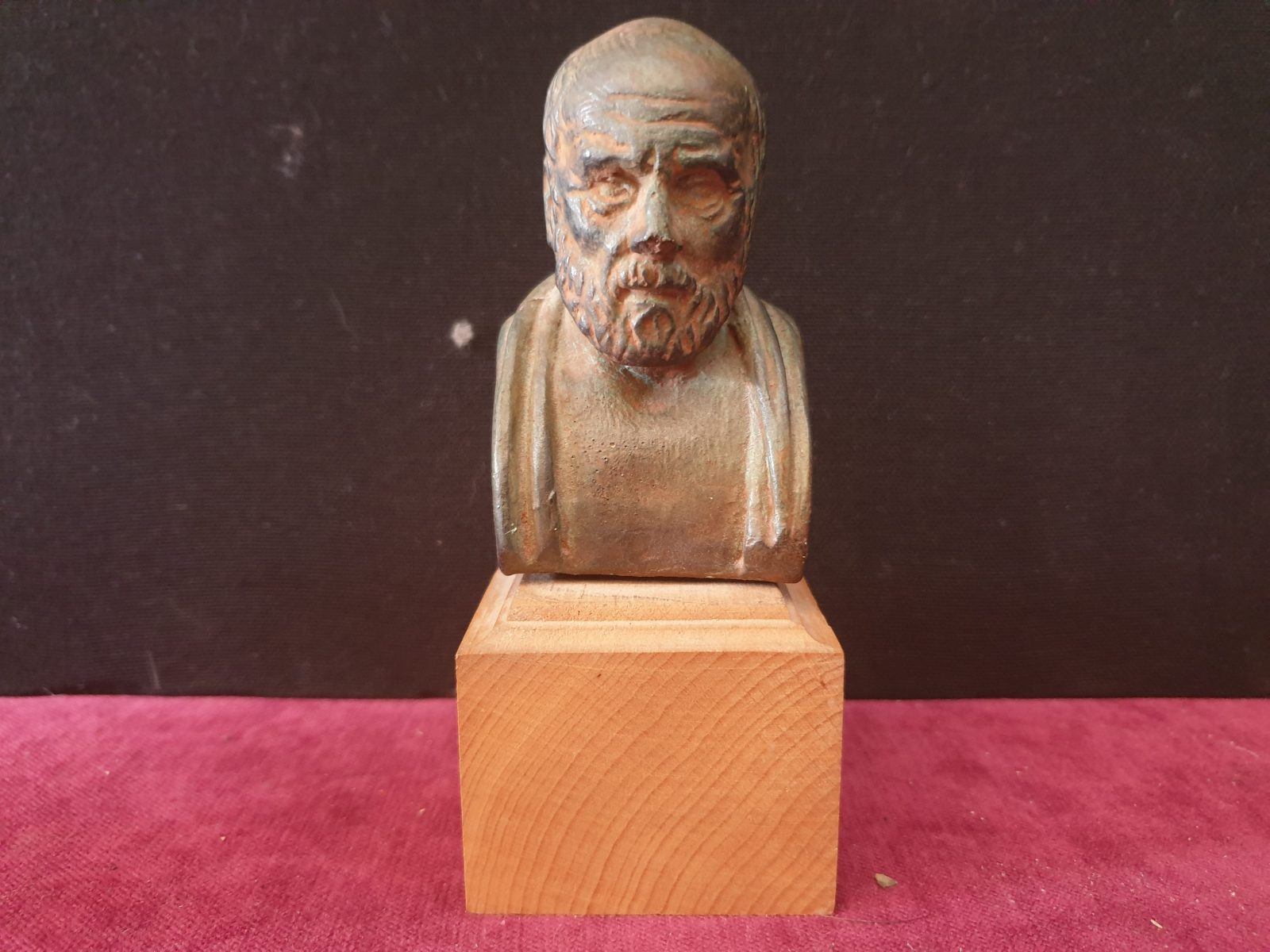 Petite tête de « Philosophe » en bronze sur socle en bois Tête; H9 x L5 x P3 Base; H4 x L5,5 x P6