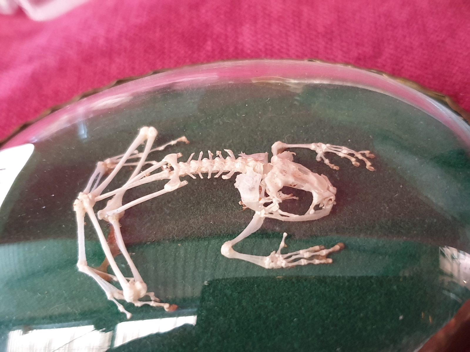 Squelette de grenouille enchâssé dans un sous verre bombé “Très bon état” H9,5 x L7,5cm