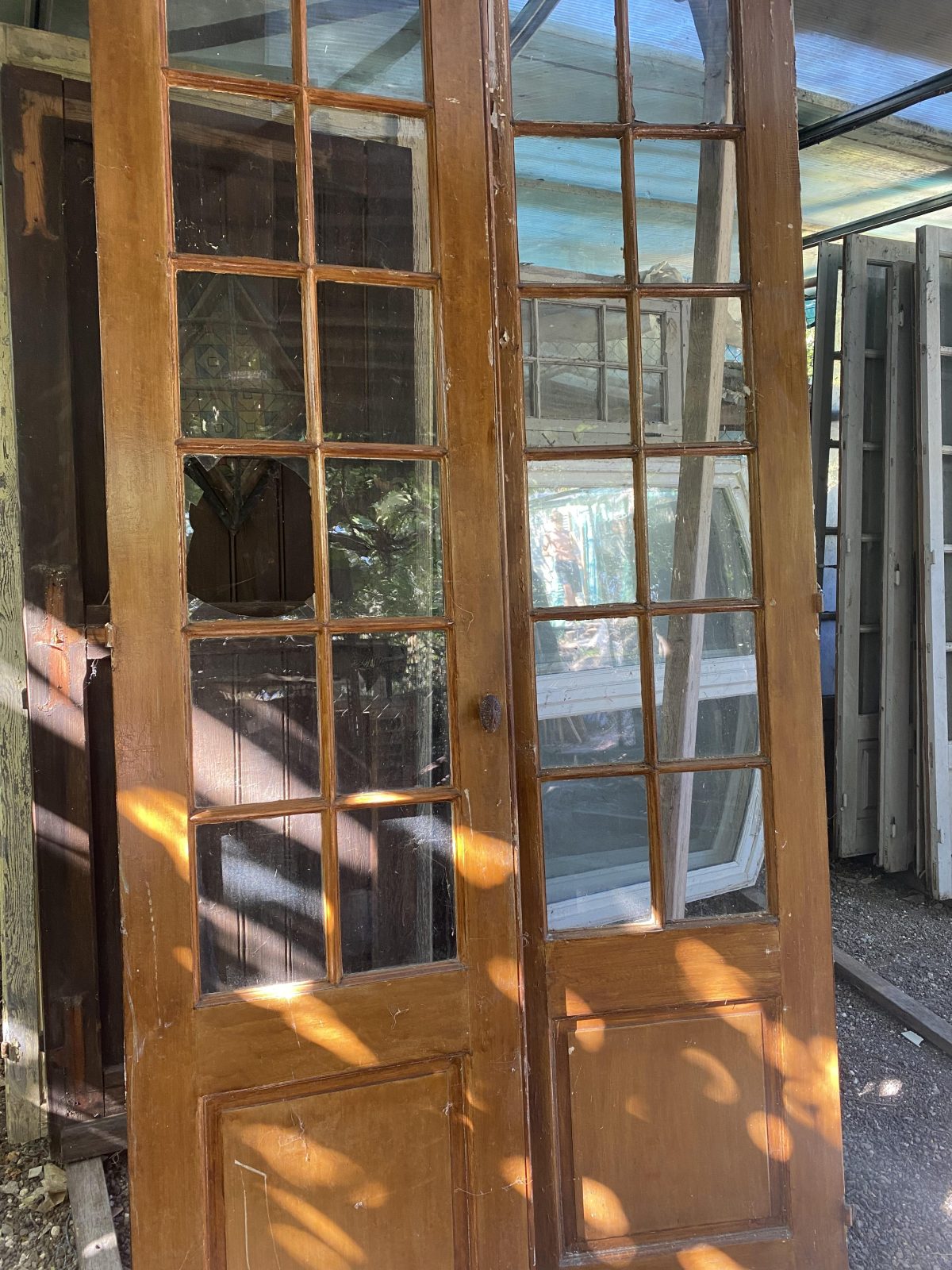 / Porte fenêtre en bois à 24 carreaux, 2 vantaux, une vitre cassée. H2.46 x L120
