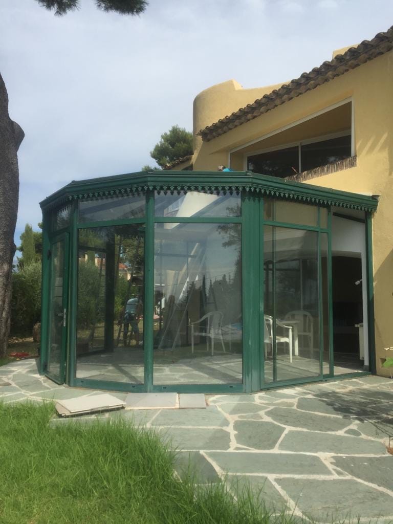 Véranda en aluminium avec gouttières incorporées, une ouverture à la francaise et 2 portes coulissantes, 2 vitres à remplacer, démontée, H270 gouttière, H320 au centre, L463 x P440, environ 20 m2