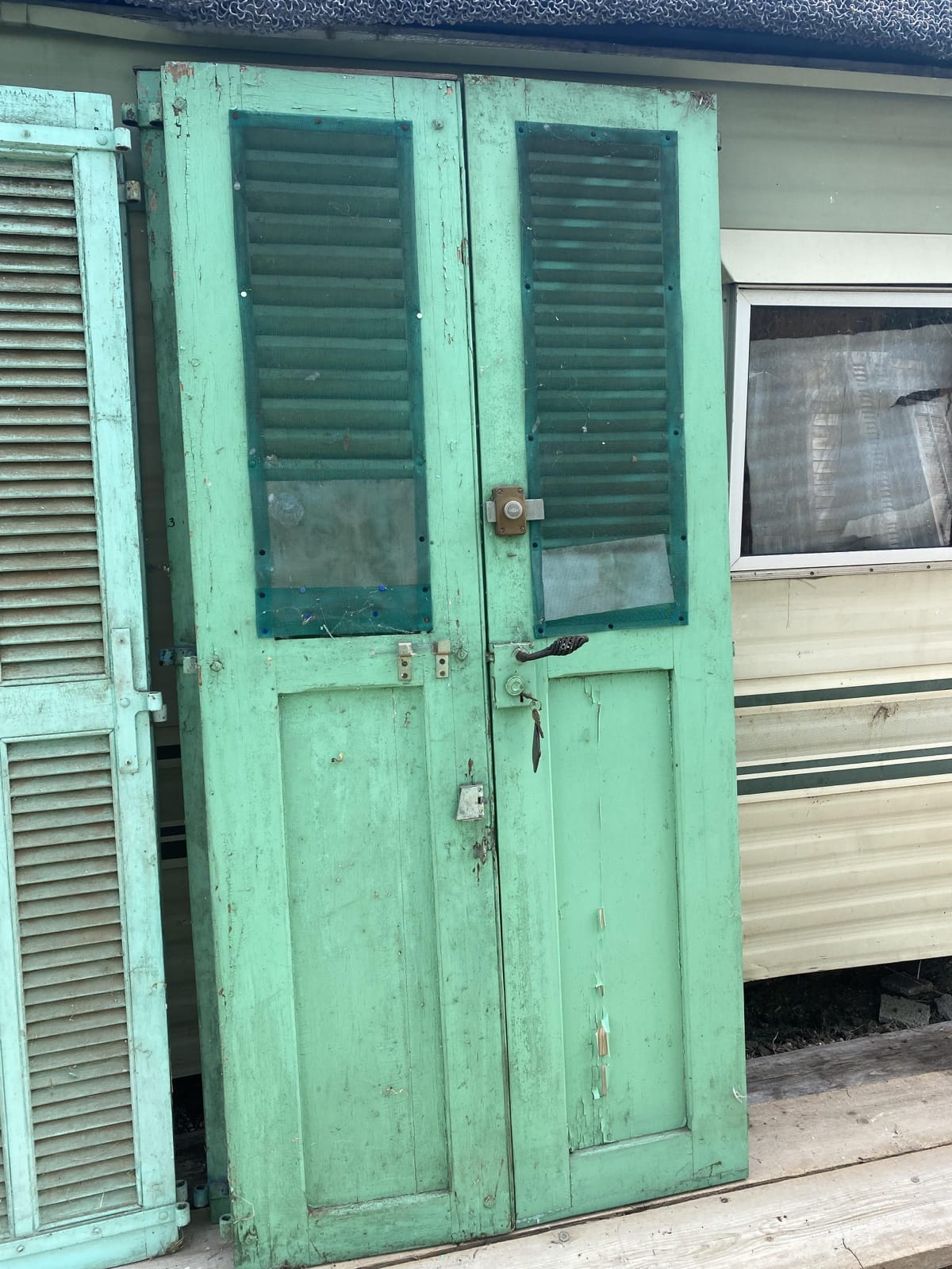 1 Paire de grands volets en bois plein et à lames, couleur turquoise avec verrou et clefs H215 x L103