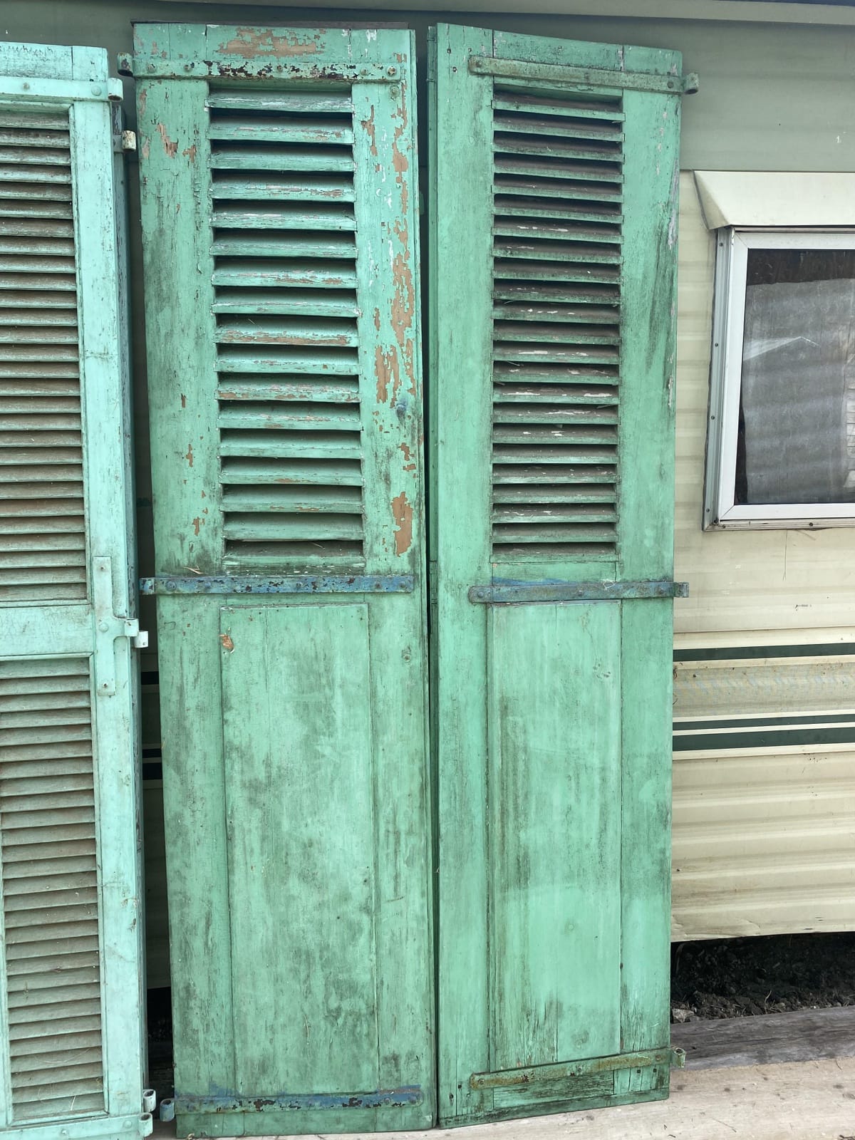 1 Paire de grands volets en bois plein et àlames, couleur turquoise