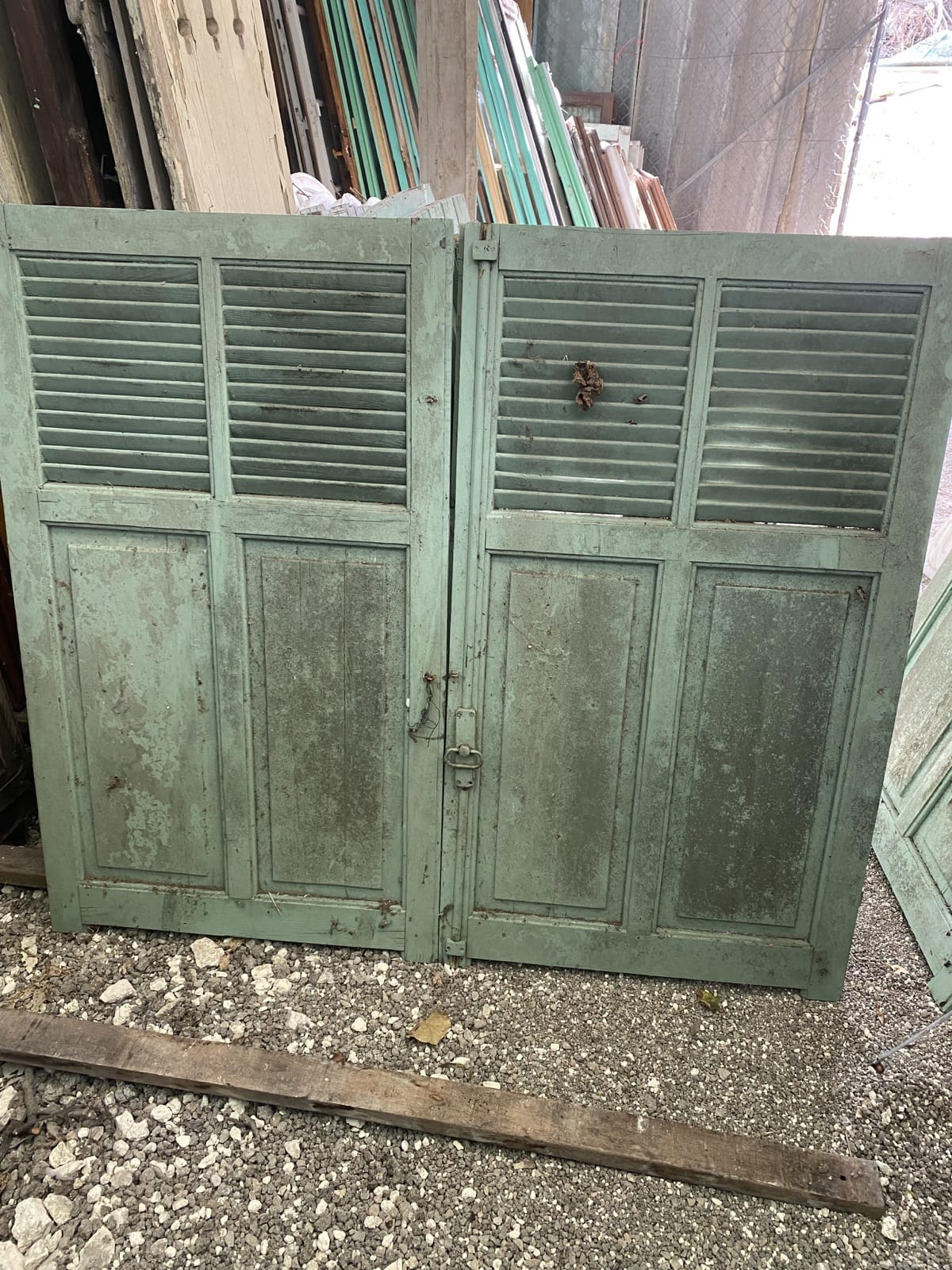 5 Paires de petit volets en bois peint turquoise, lames sur partie haute H120 x L140