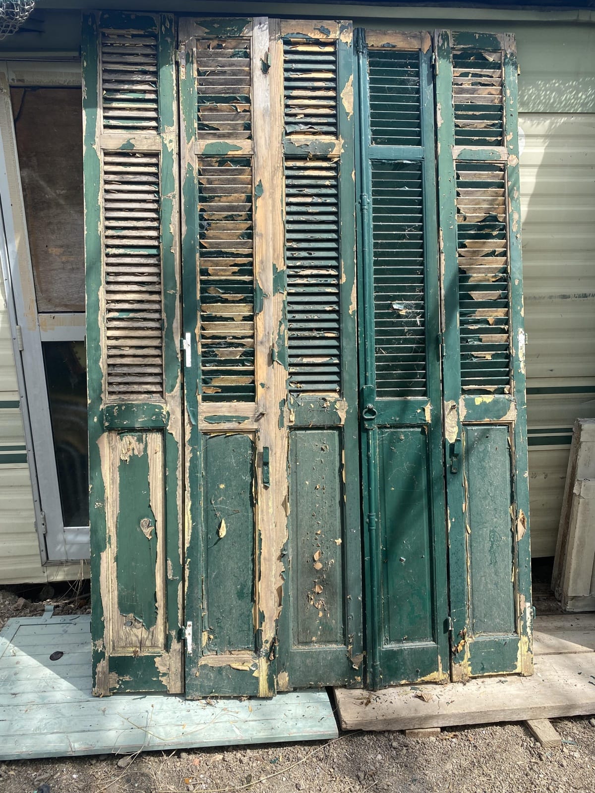 5 Pans de grand volets fins en bois peint vert, partie haute lames à la francaise, partie base plein H220 x L146 un pans L30