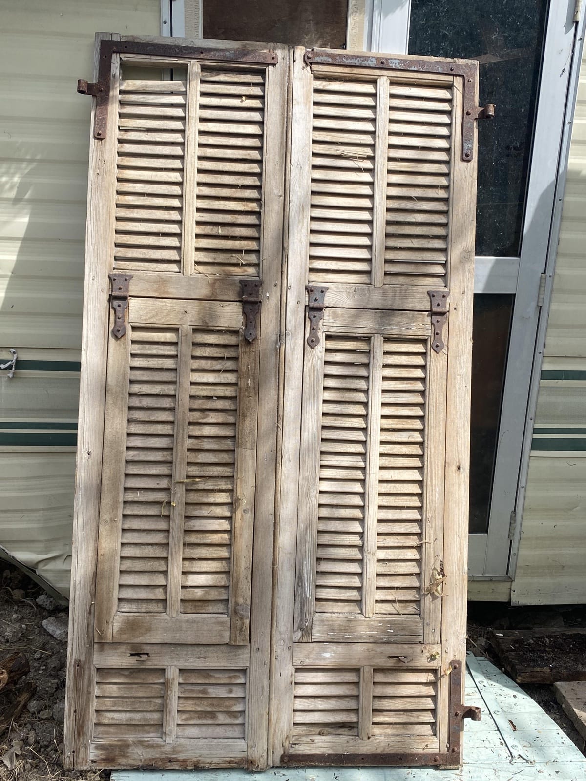 Paire de grands volets en bois lames à la francaise, décapés à battants perciennes H177 x L96