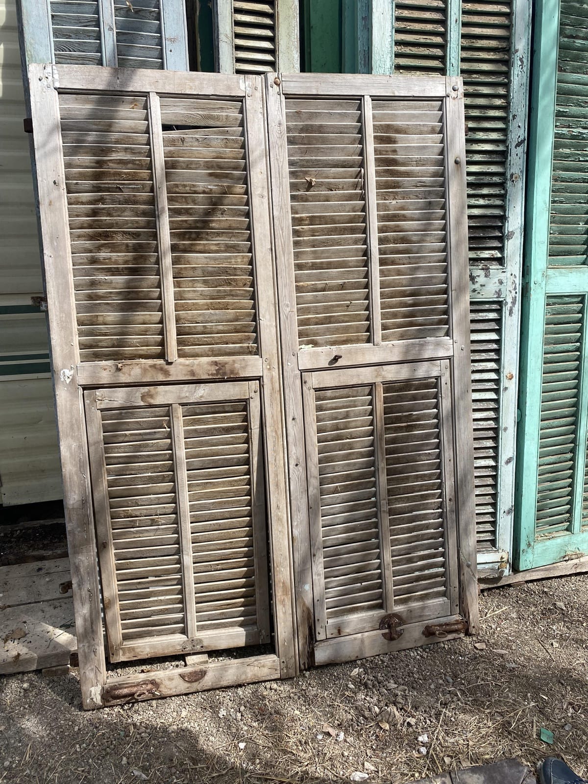 Paire de grands volets en bois lames à la francaise, décapés à battants perciennes, partie basse abimée H170 x L119