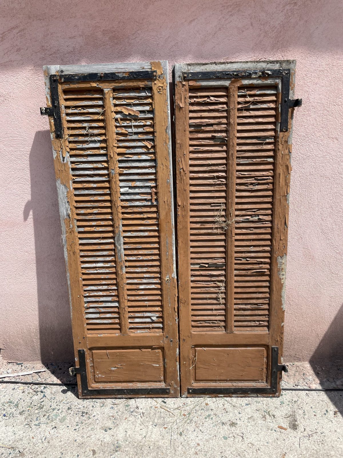 Porte fenêtre en bois à 4 carreaux, 2 vantaux, une vitre cassée. Peint vert et couleur bois. H223 x L100
