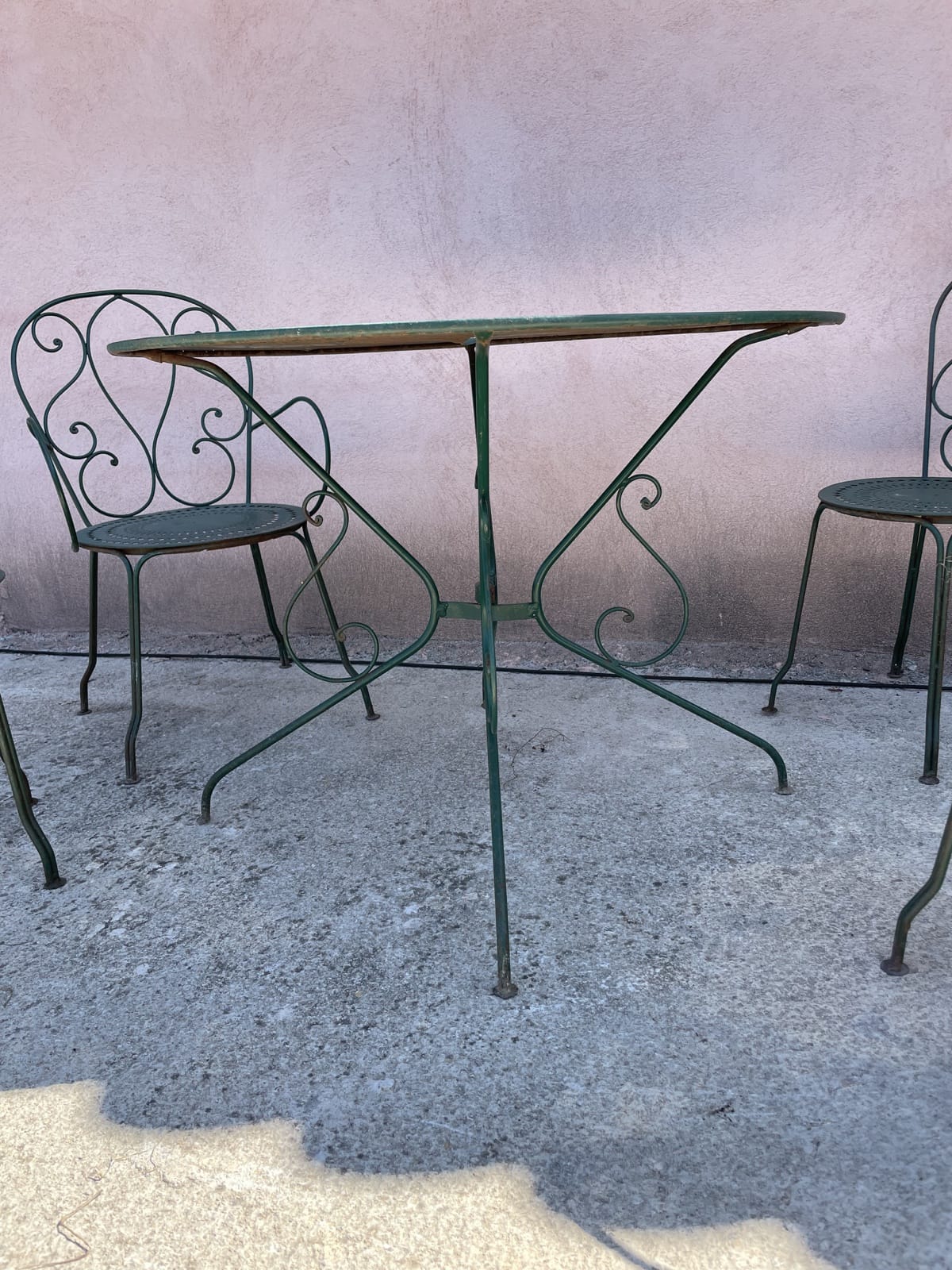 Table ronde verte fer forgé 1950 H73 x D98 – 2 fauteuils H86 x L54 x P50 – 2 chaises H86 x L40 x P40