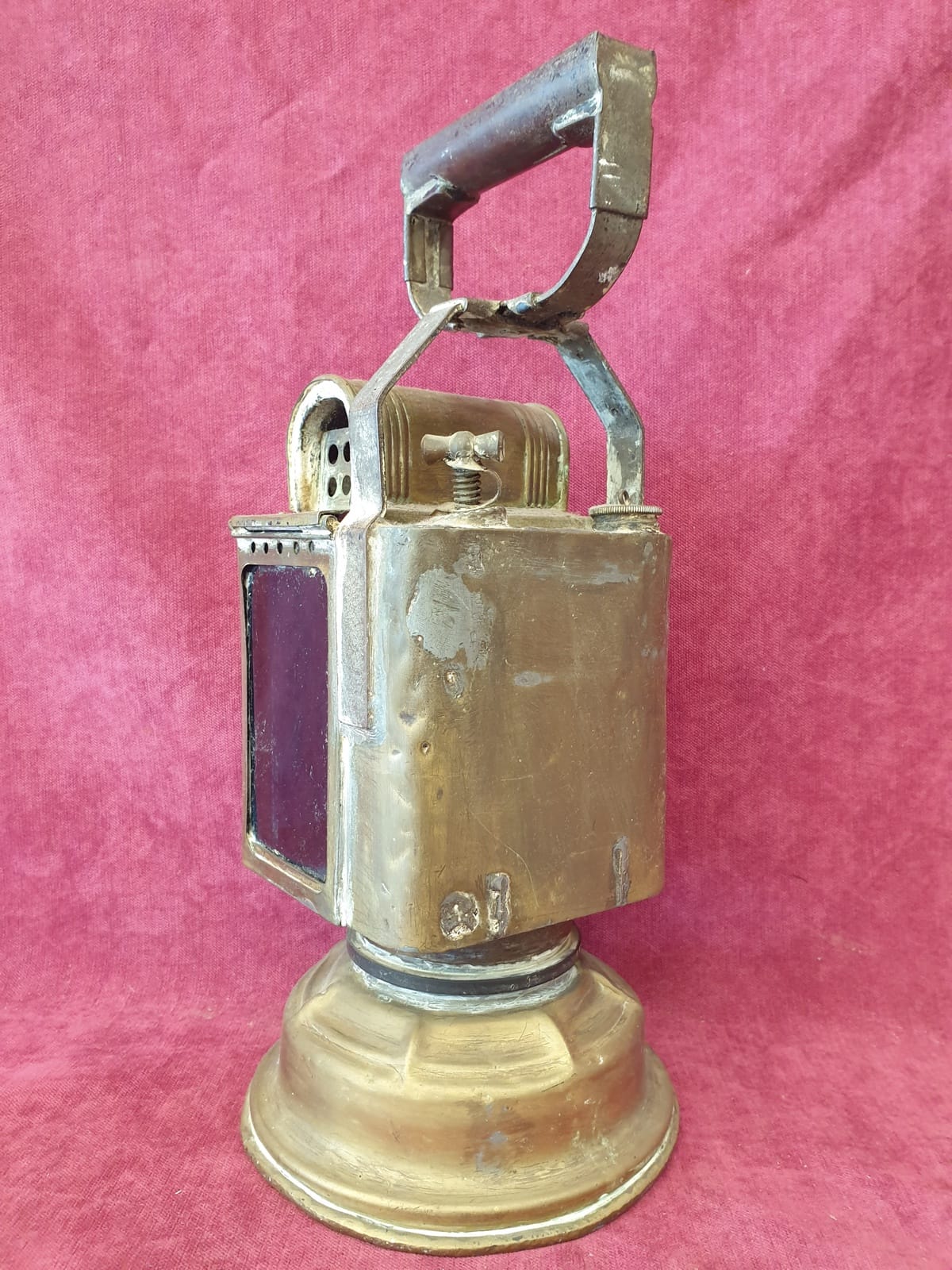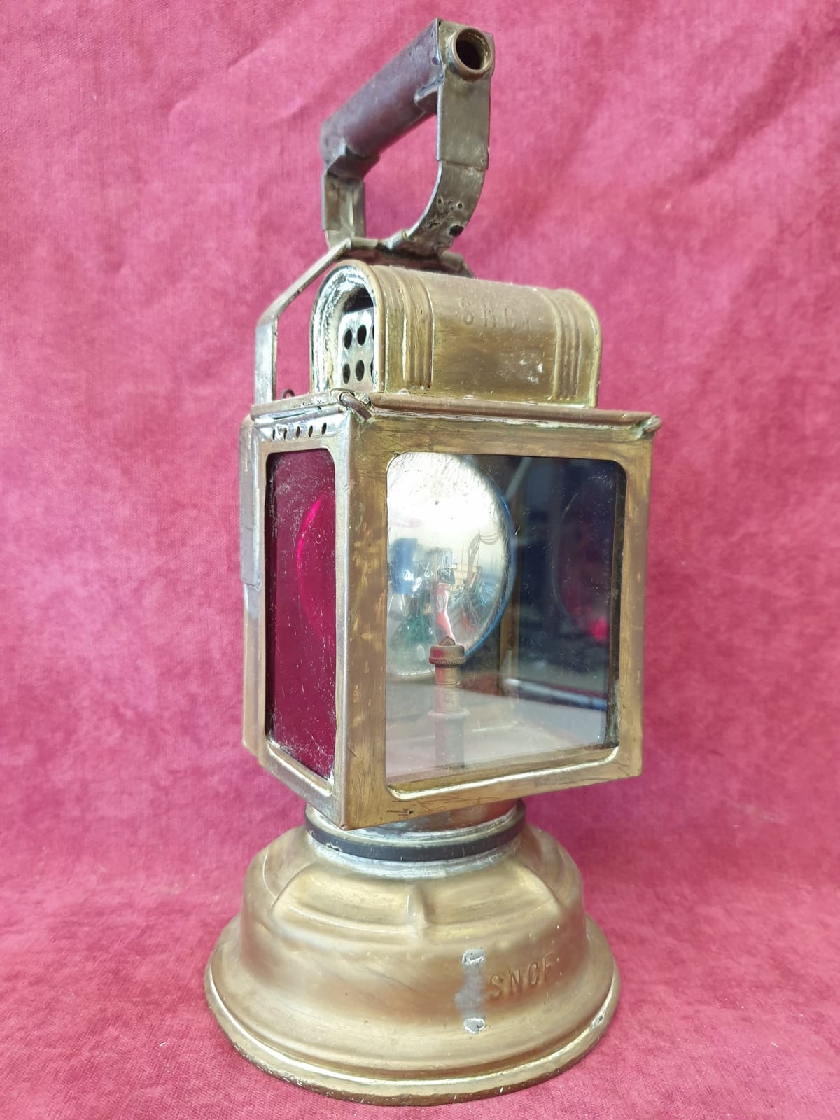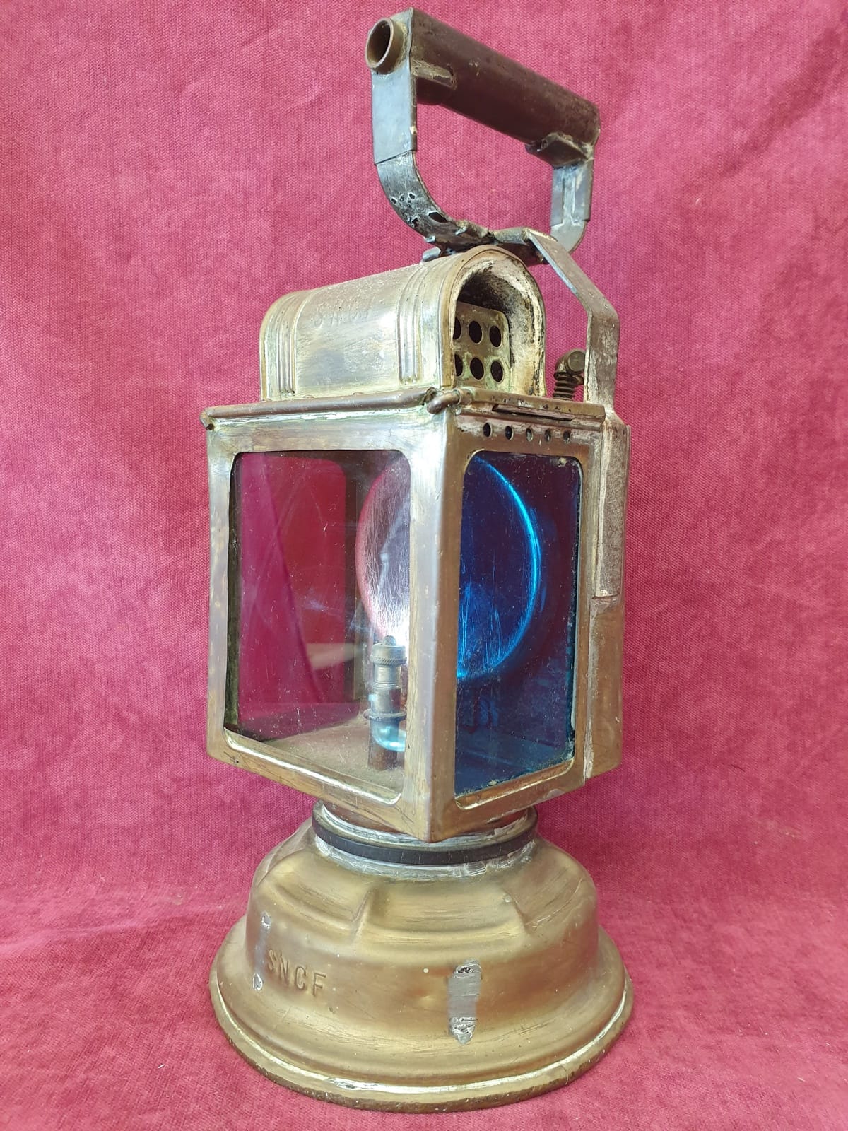 Lampe a petrol d’urgence SNCF – cuivre avec verres rouge et bleu et miroir – D15