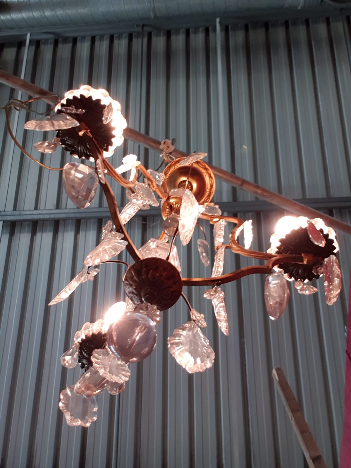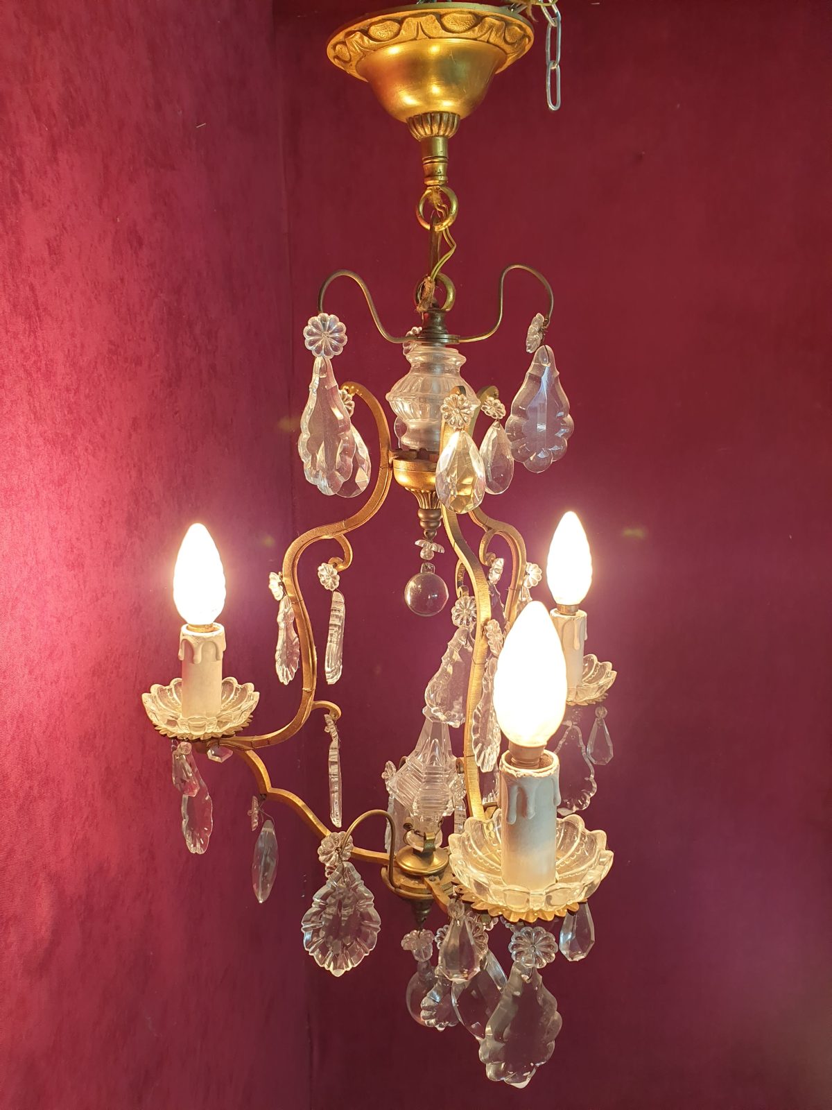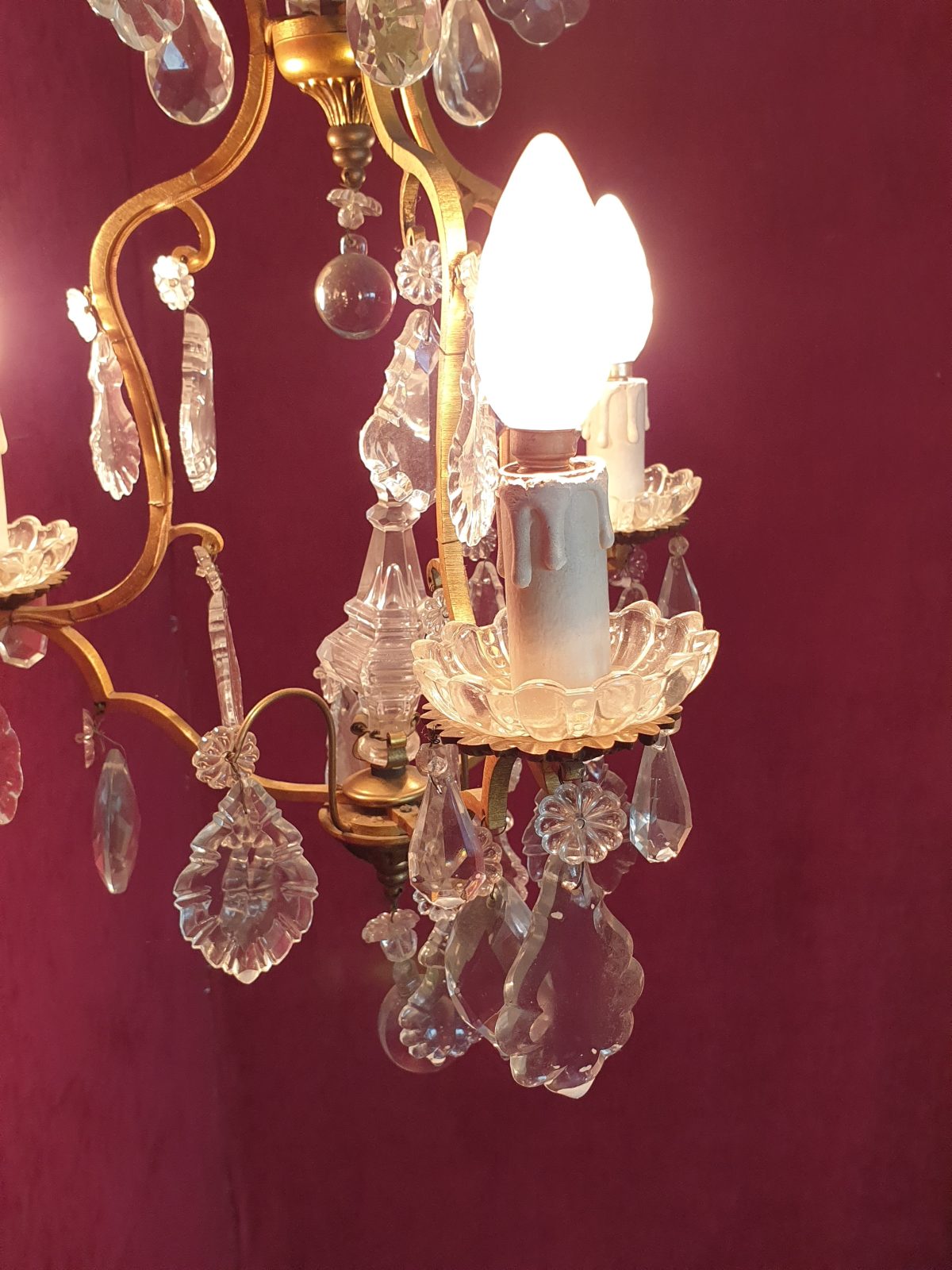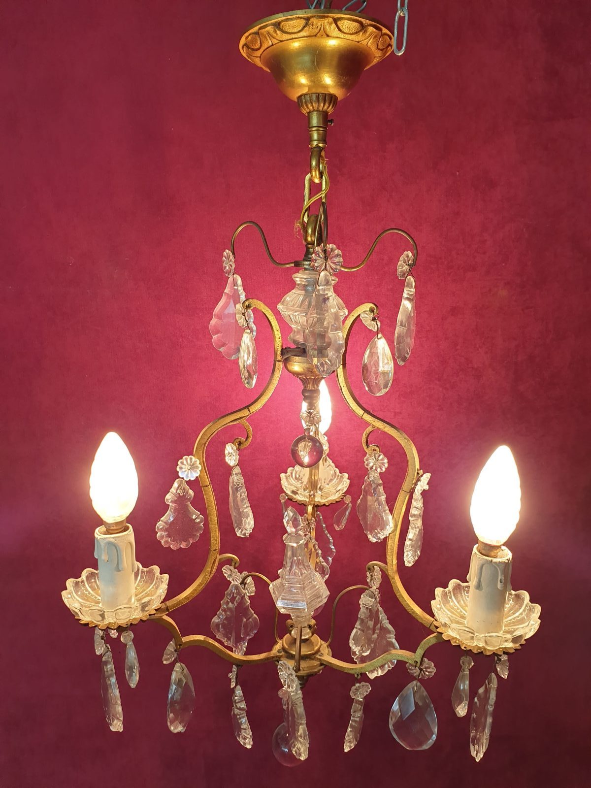 Lustre rocaille en bronze doré à pampilles, 3 lumières, H68 x D37