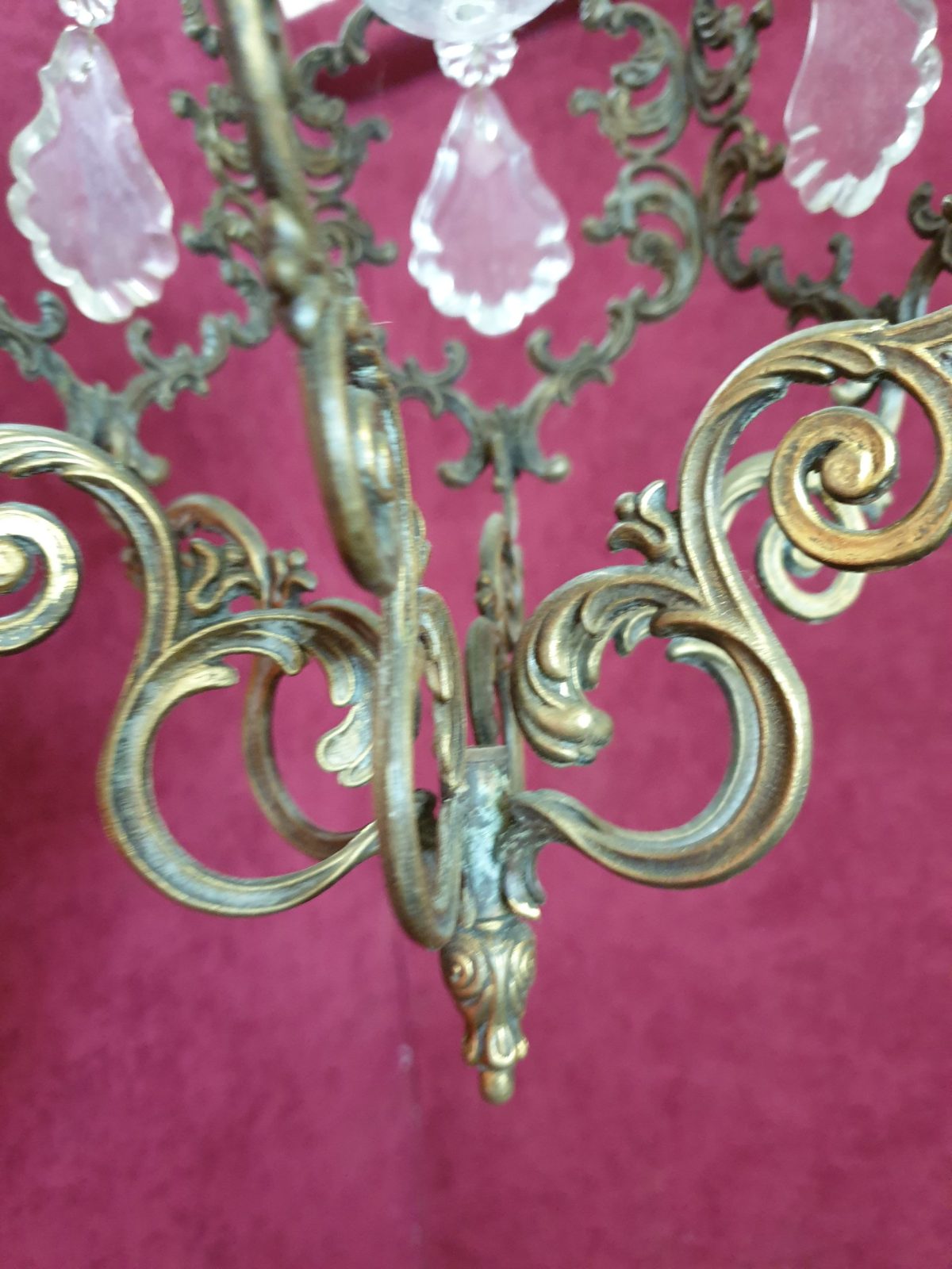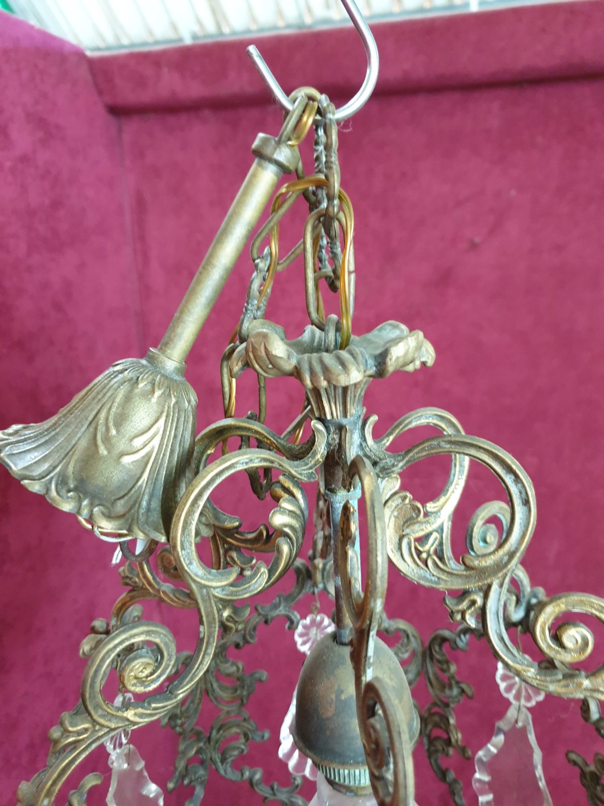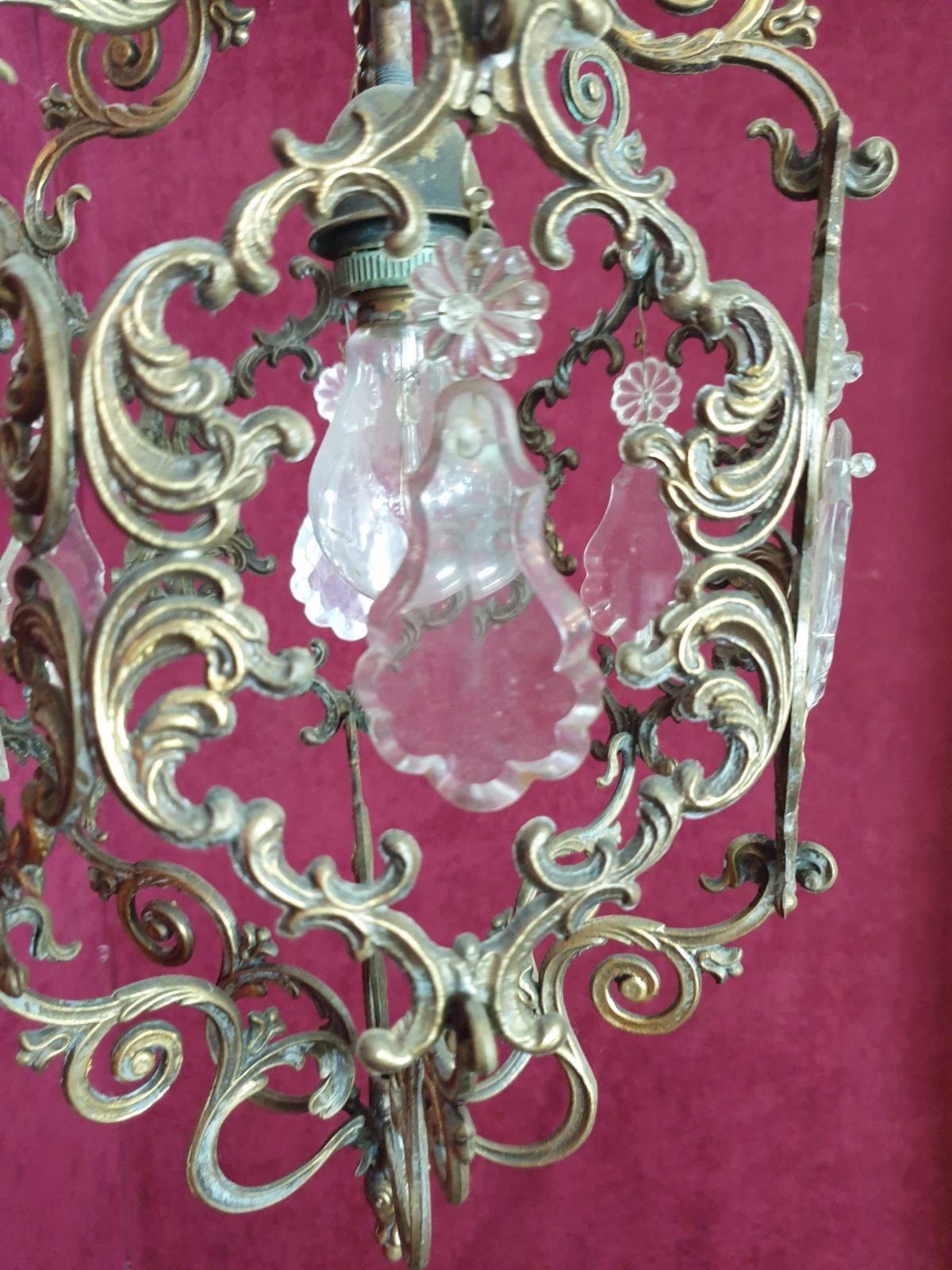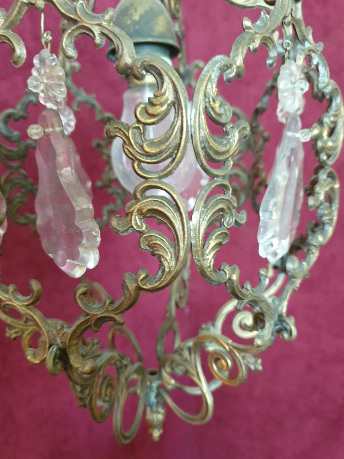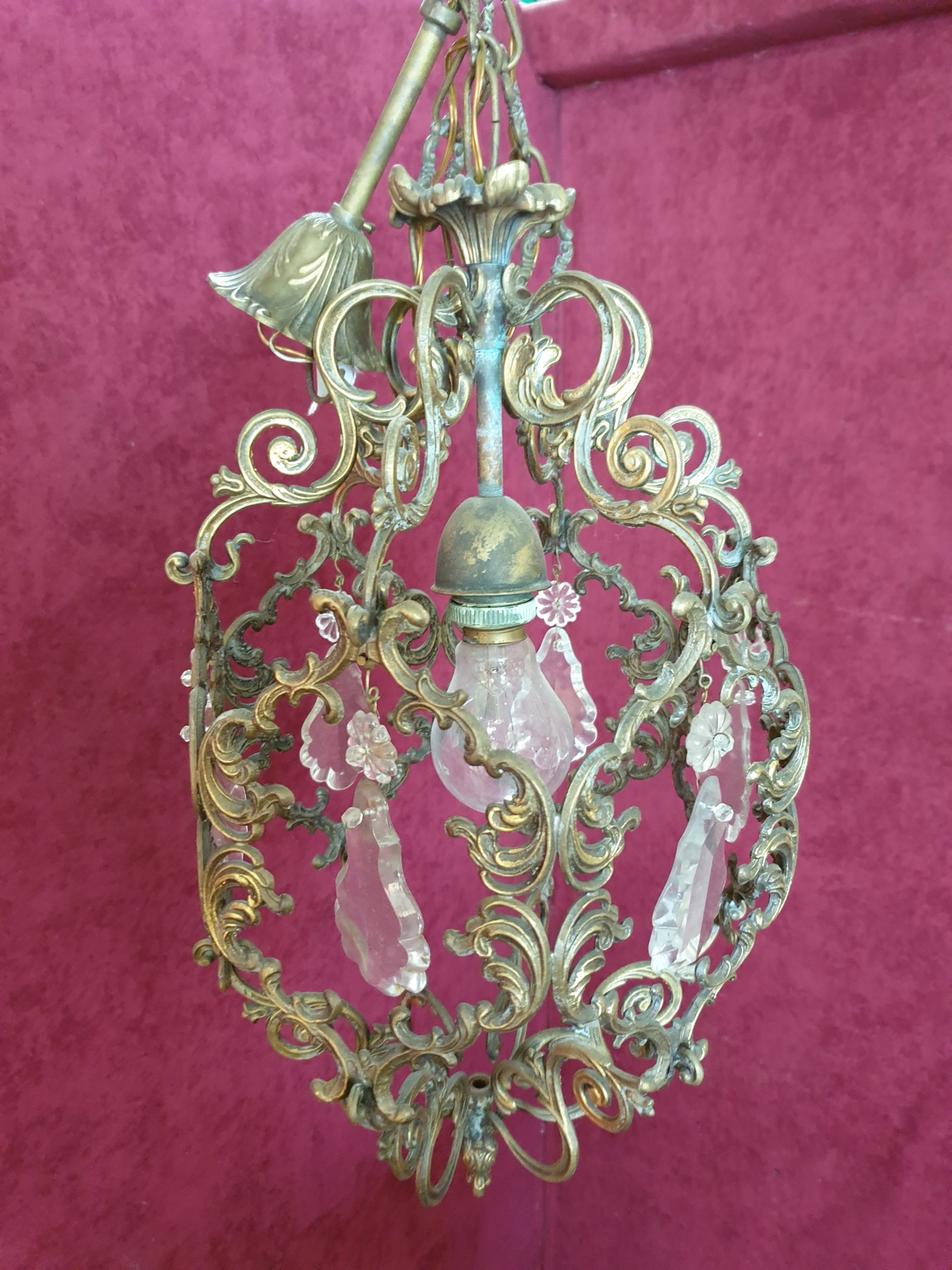Lustre corbeille en laiton style rocaille, pampilles, 1 lumière