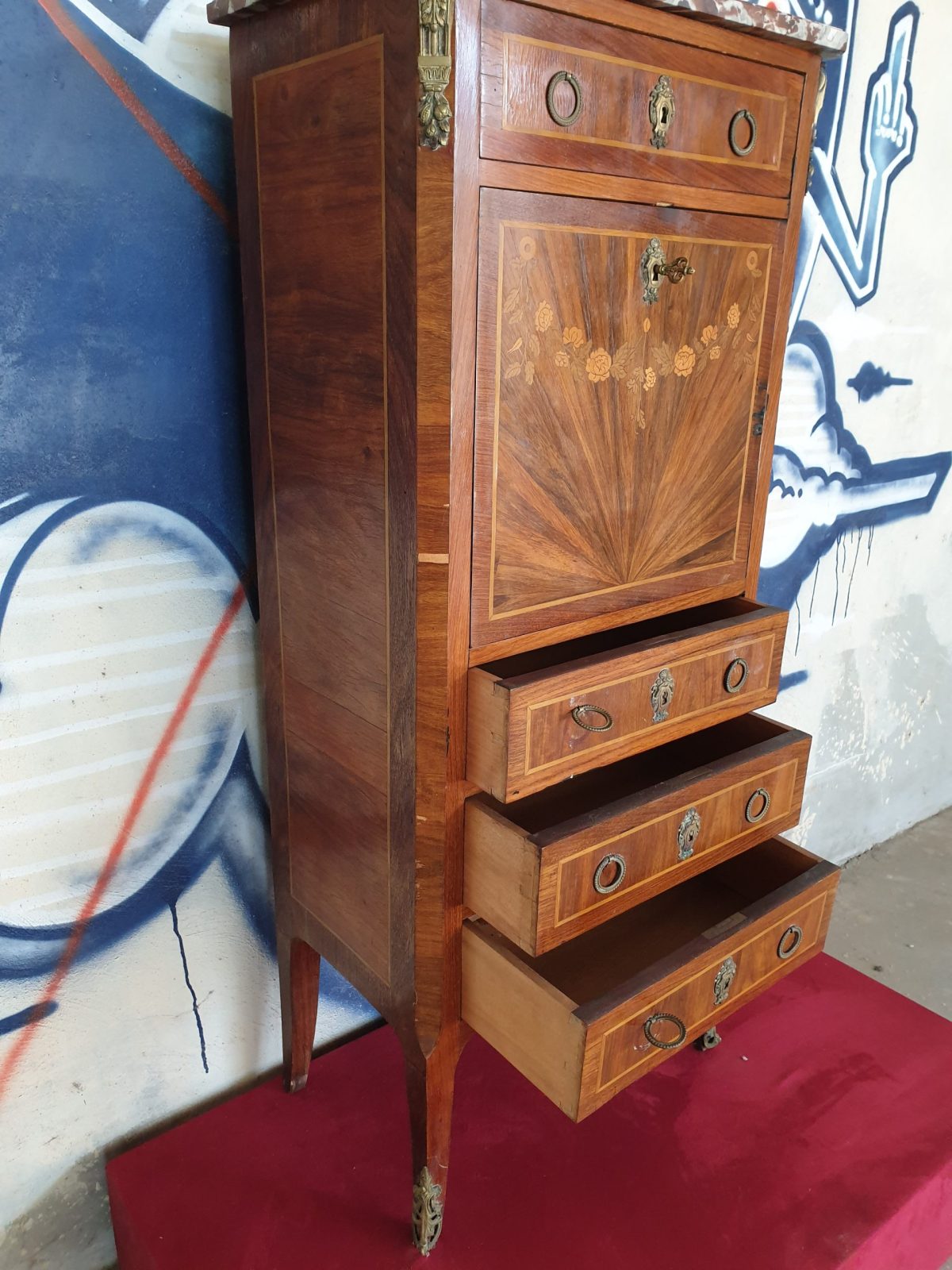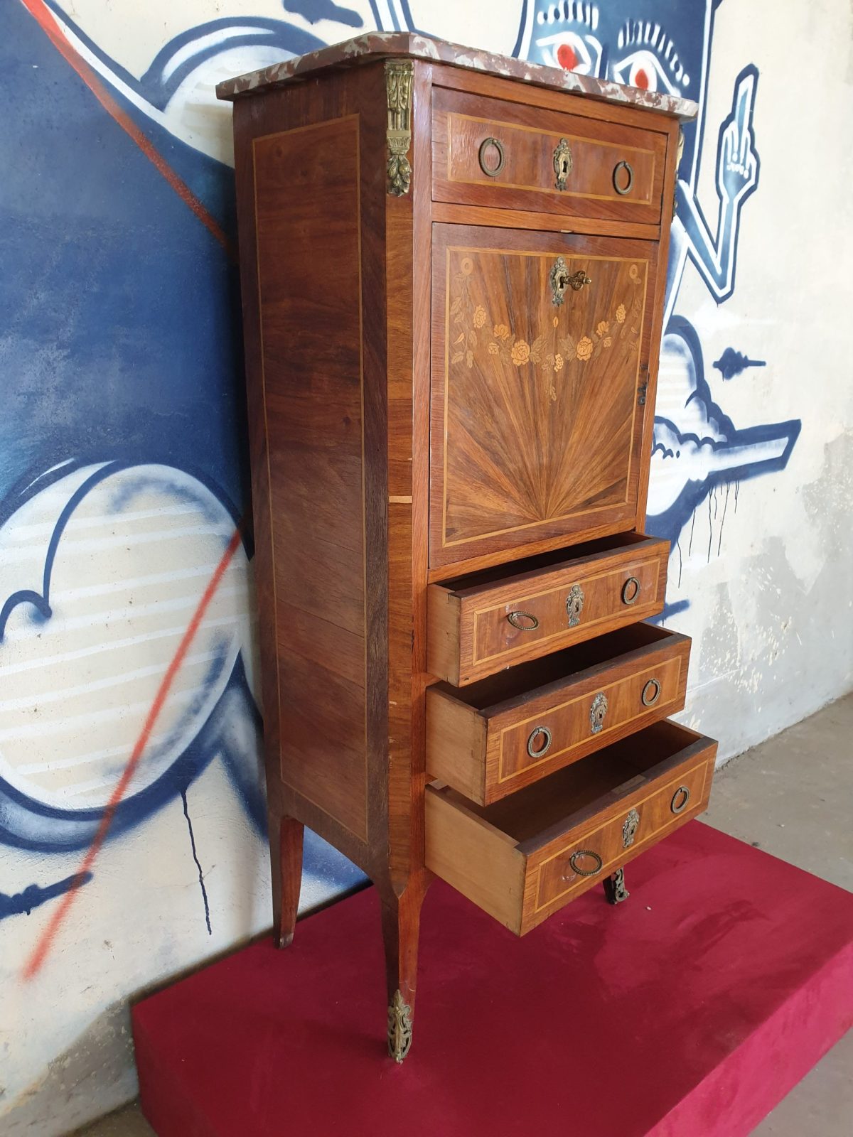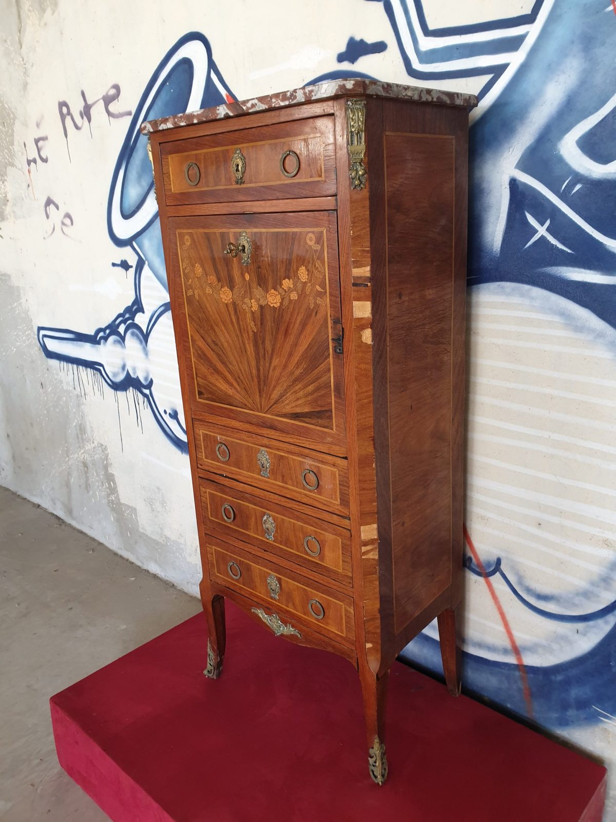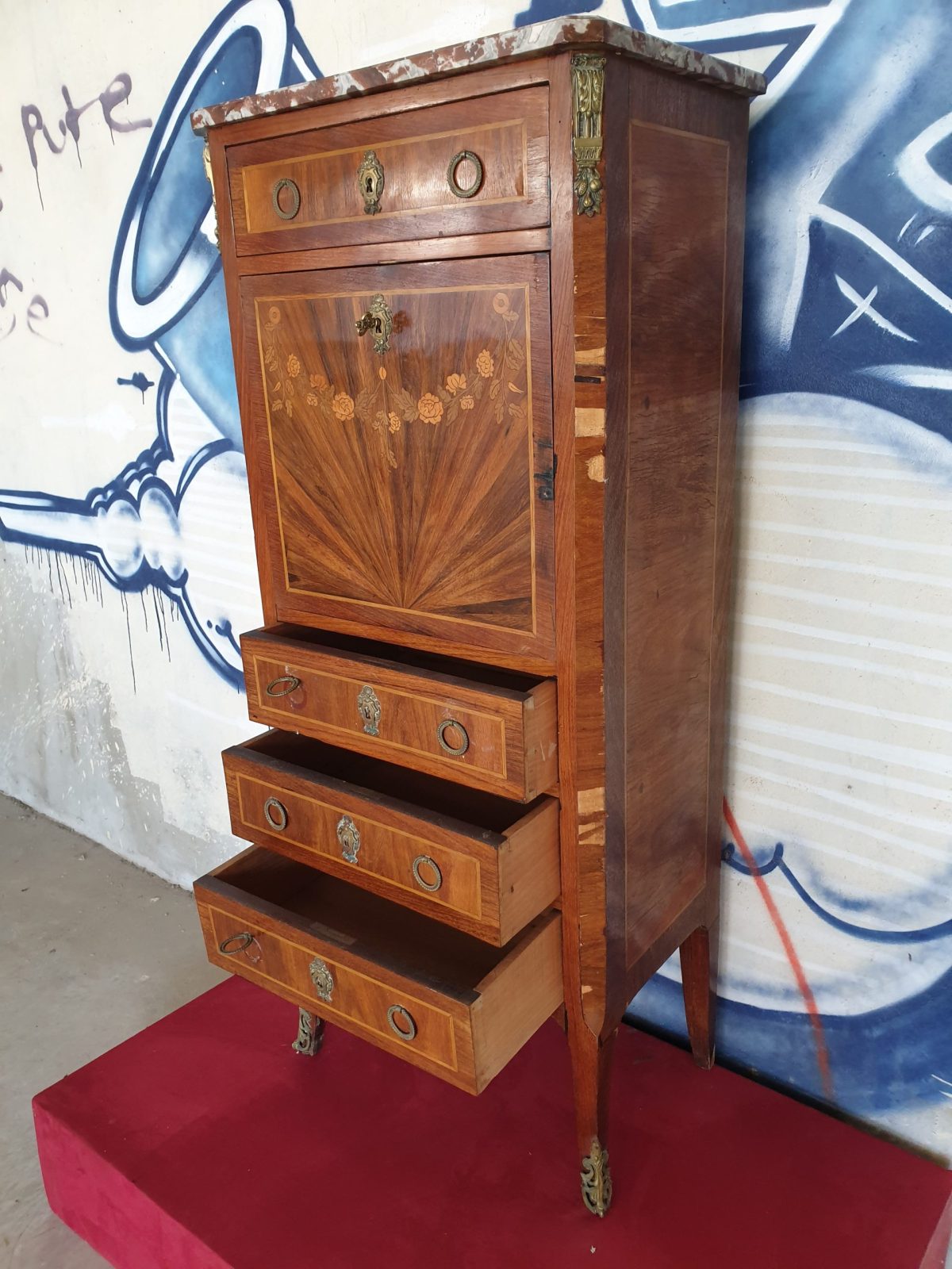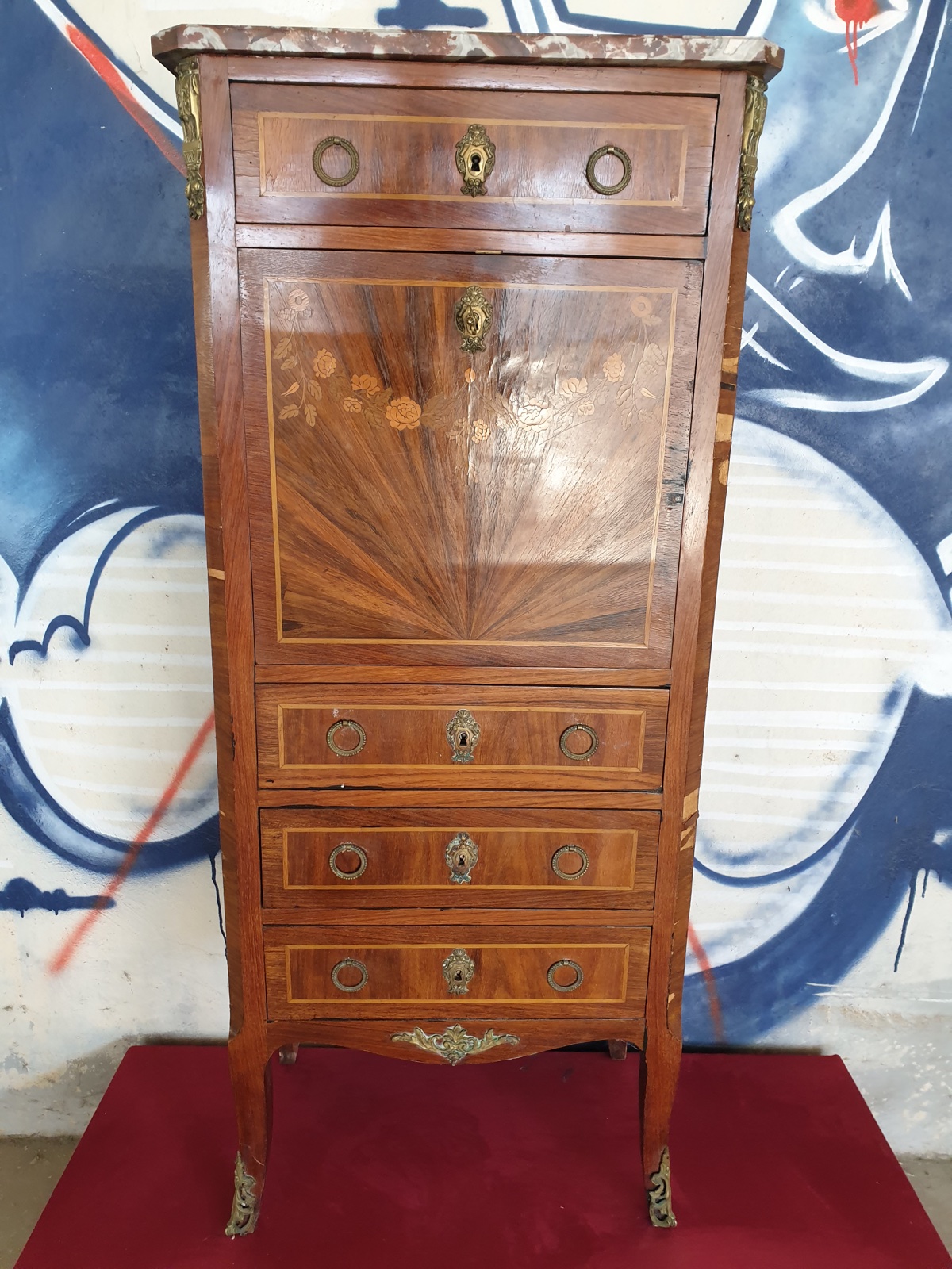 Secrétaire à abatant style Louis XVI, à décor floral, placage bois de rose, 6 tiroirs, dessus marbre, à restaurer, H130 x L55.5 x P33.5
