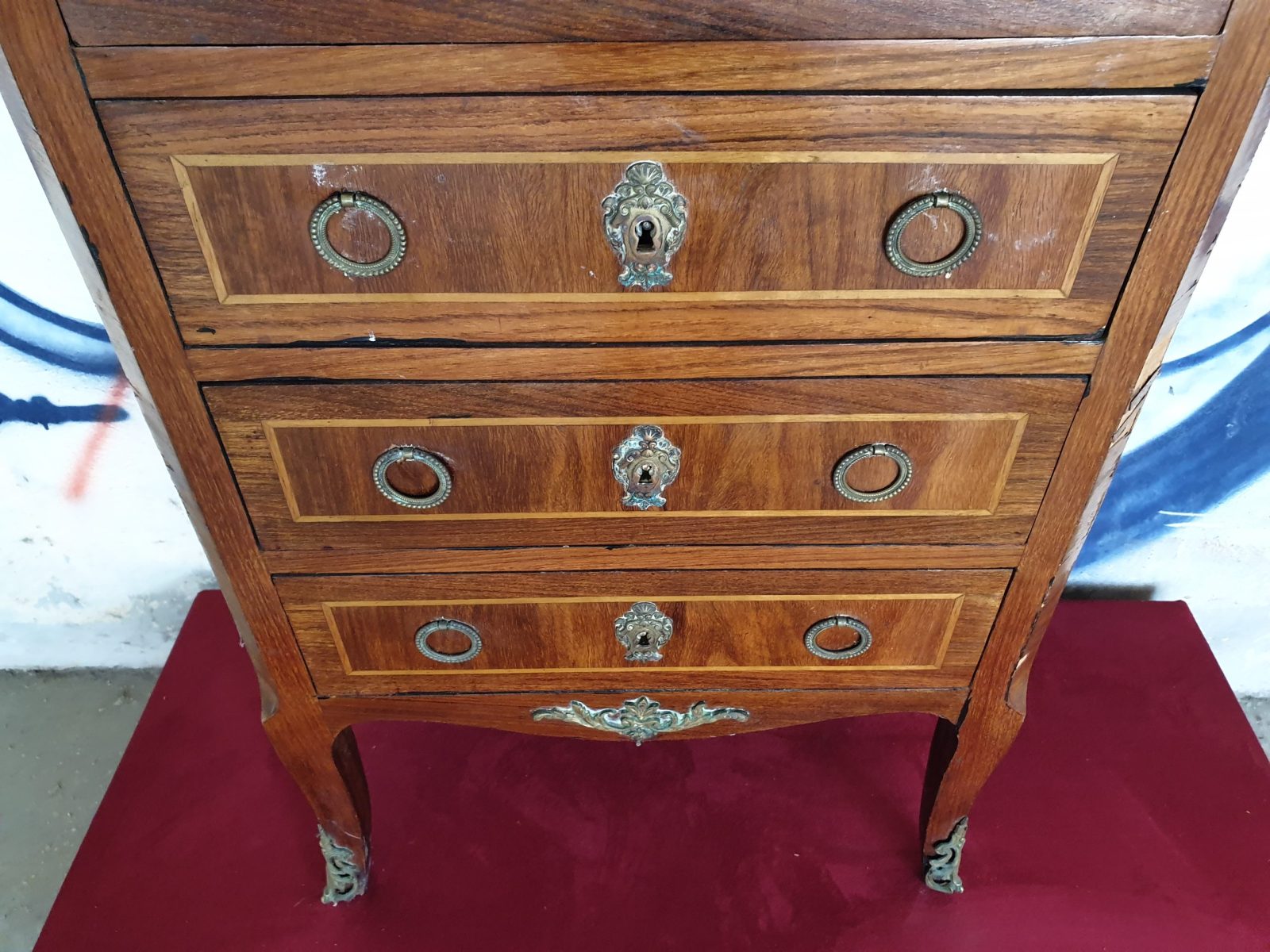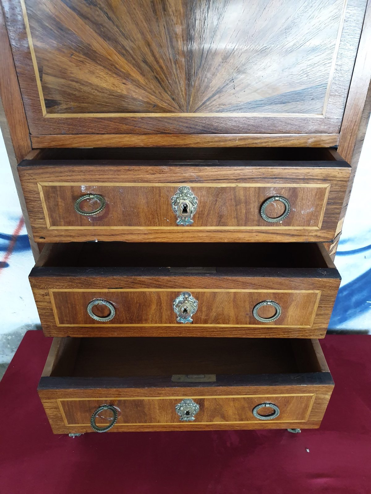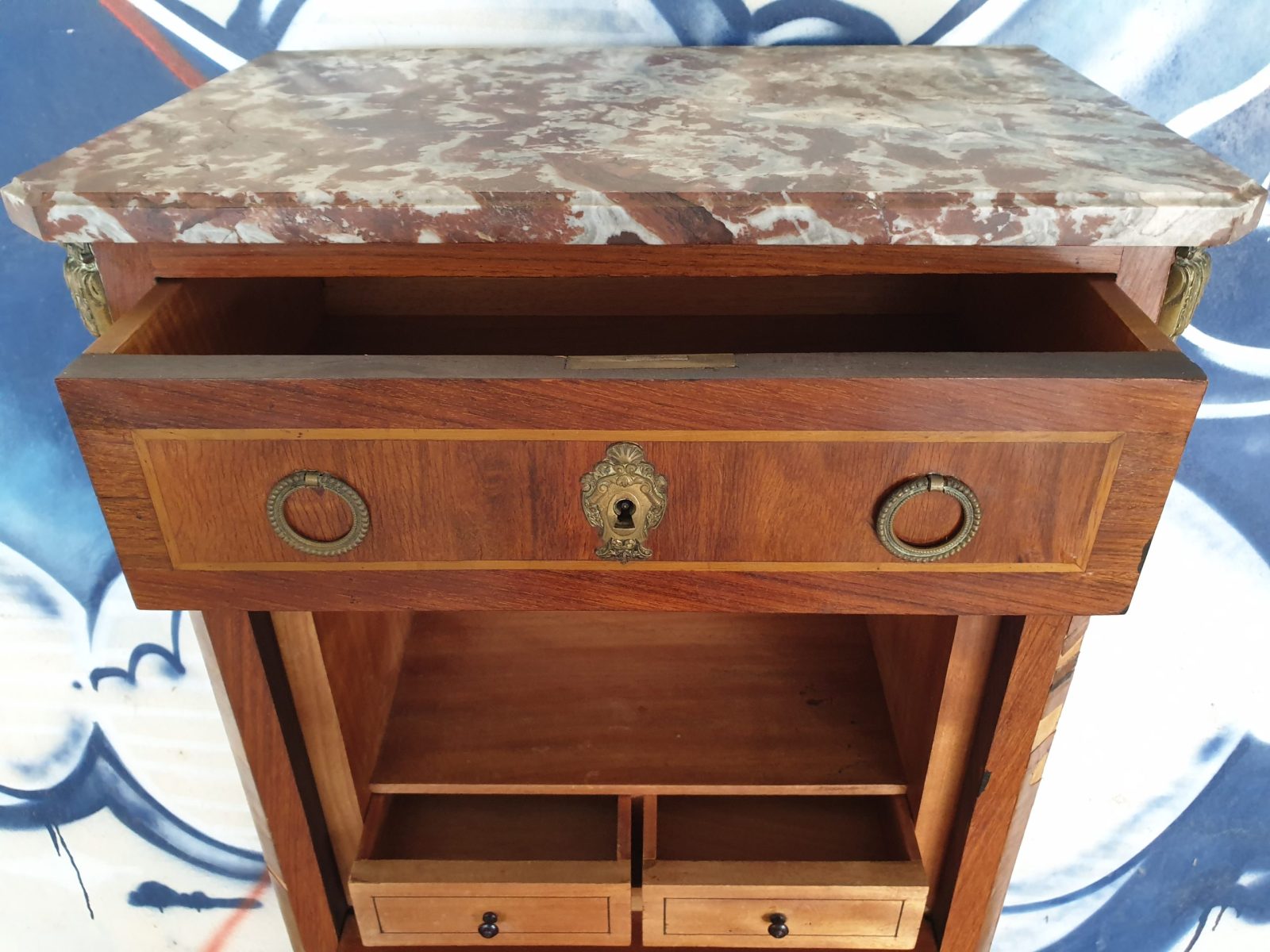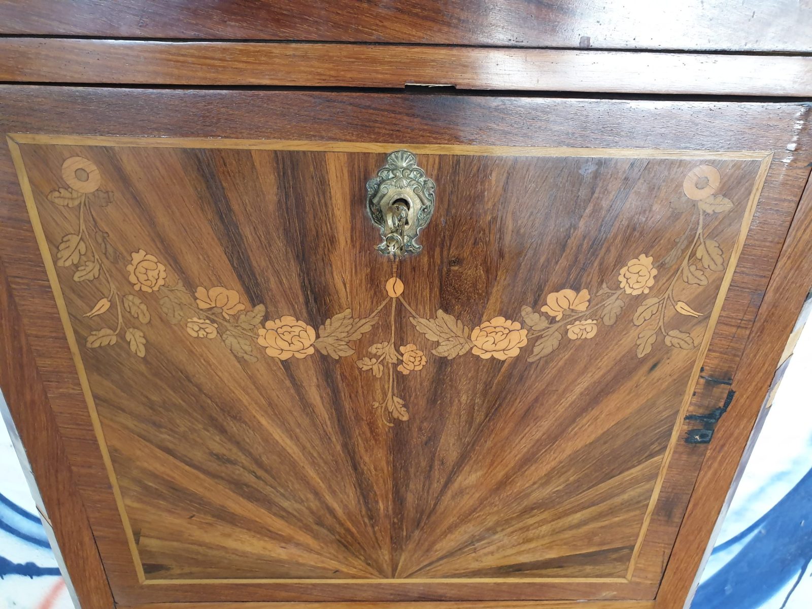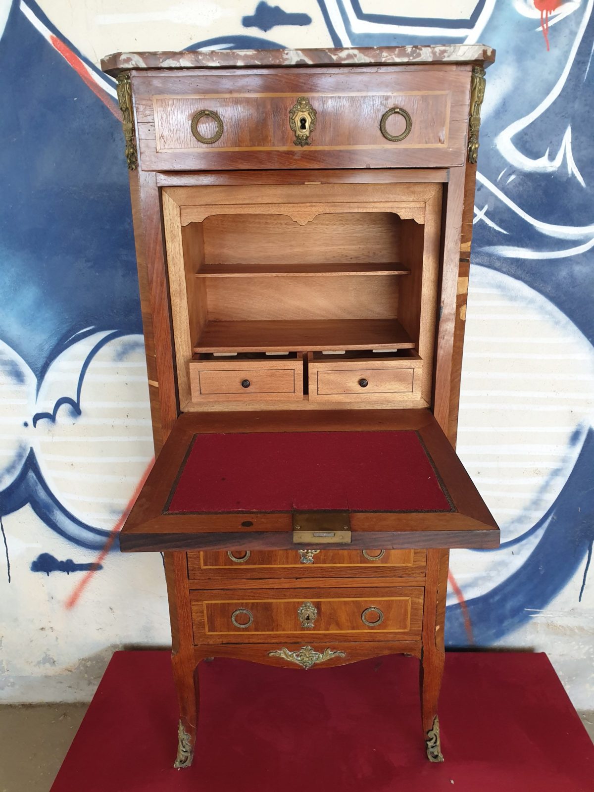 Secrétaire à abatant style Louis XVI, à décor floral, placage bois de rose, 6 tiroirs, dessus marbre, à restaurer, H130 x L55.5 x P33.5