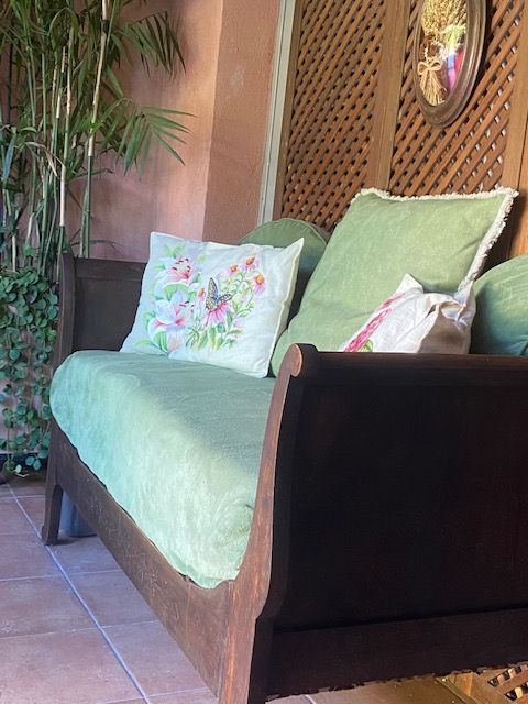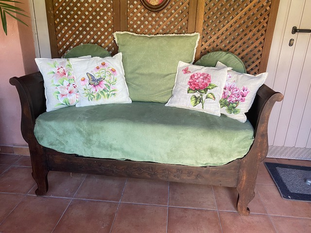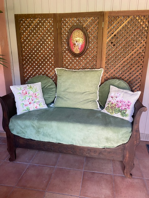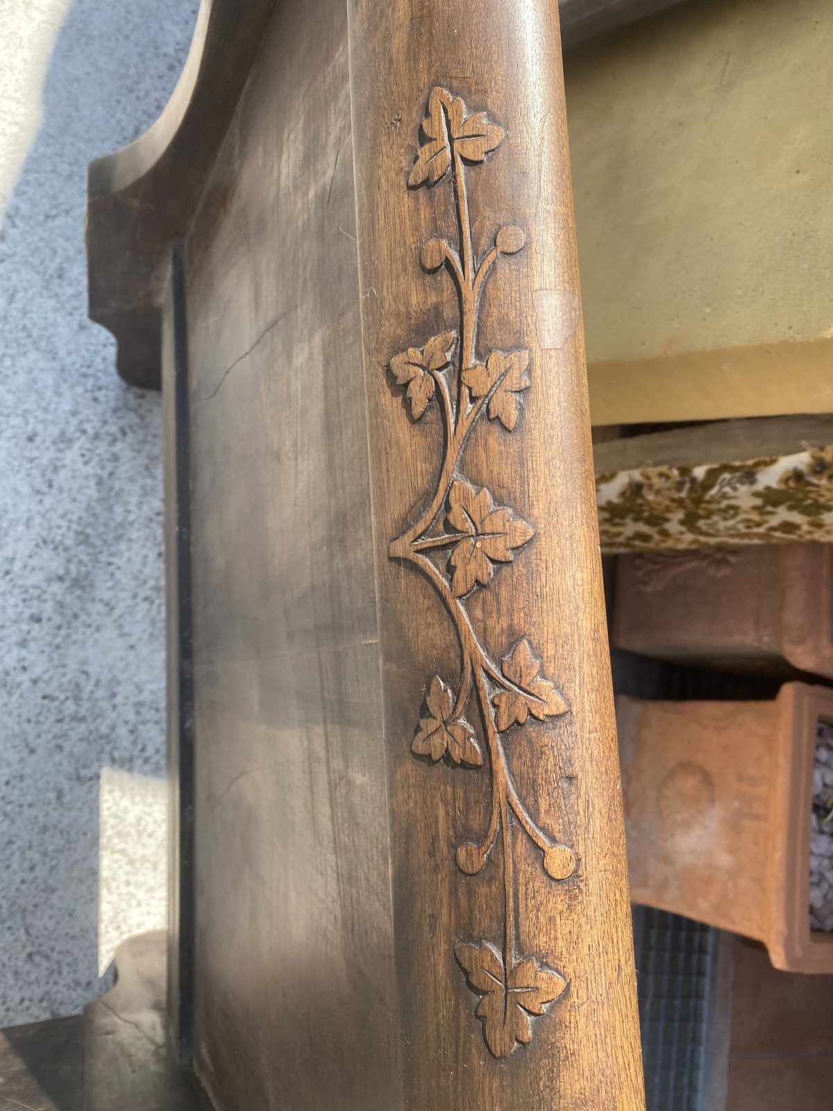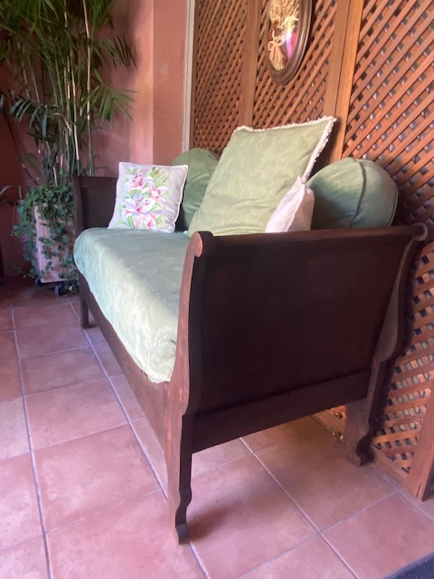 Lit d’appuis Louis Philippe en noyer finement ouvragé de feuilles de lierre et avec son sommier fessant office de banquette.