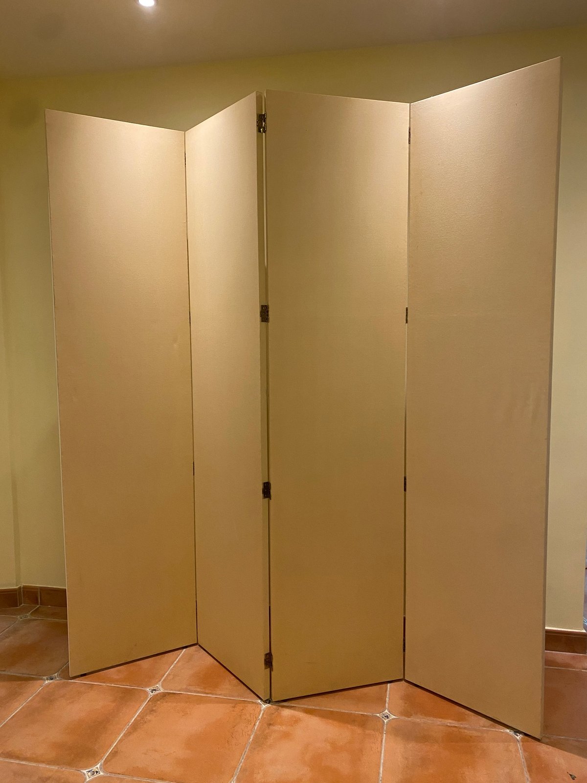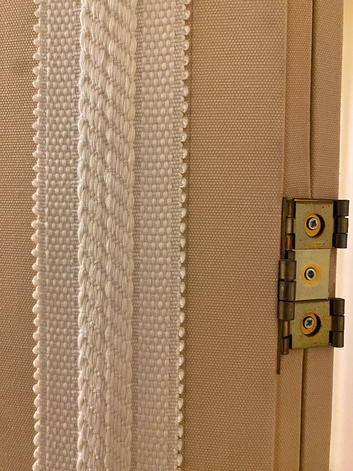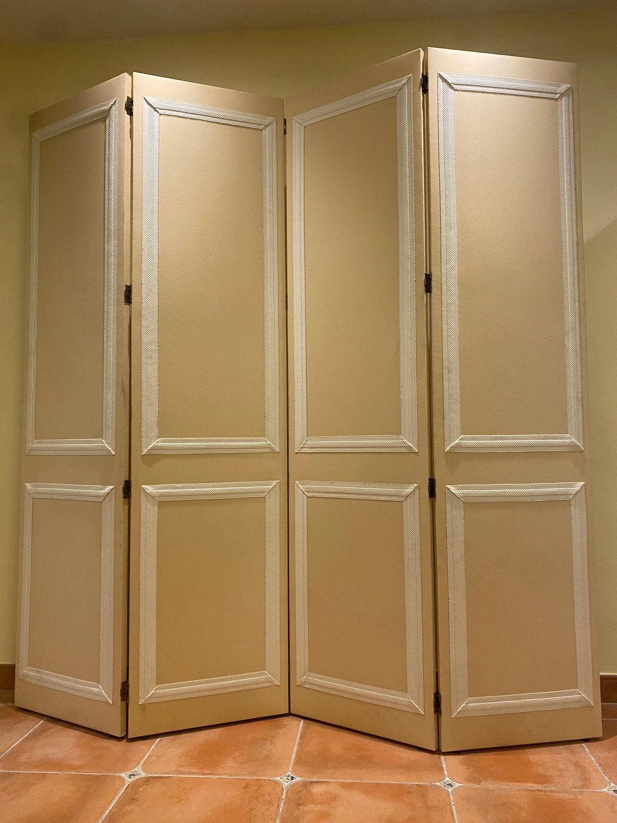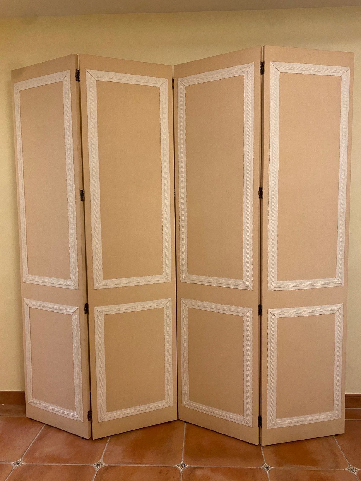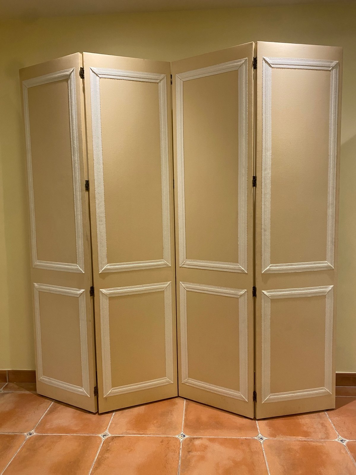 / Paravent de 4 vantaux tapissier tissus beige galonnés