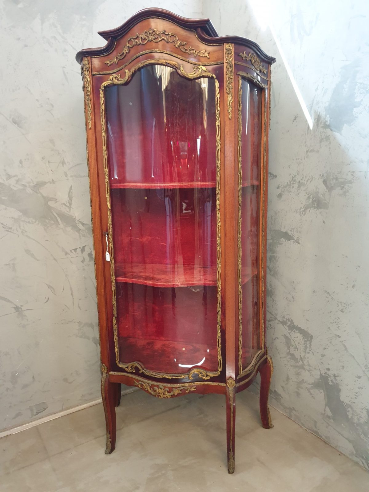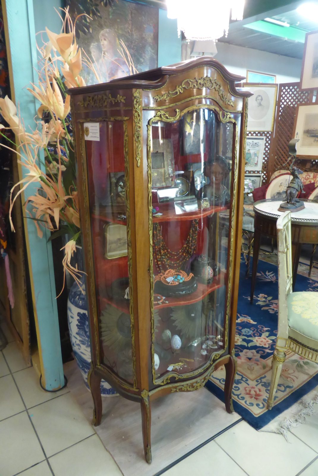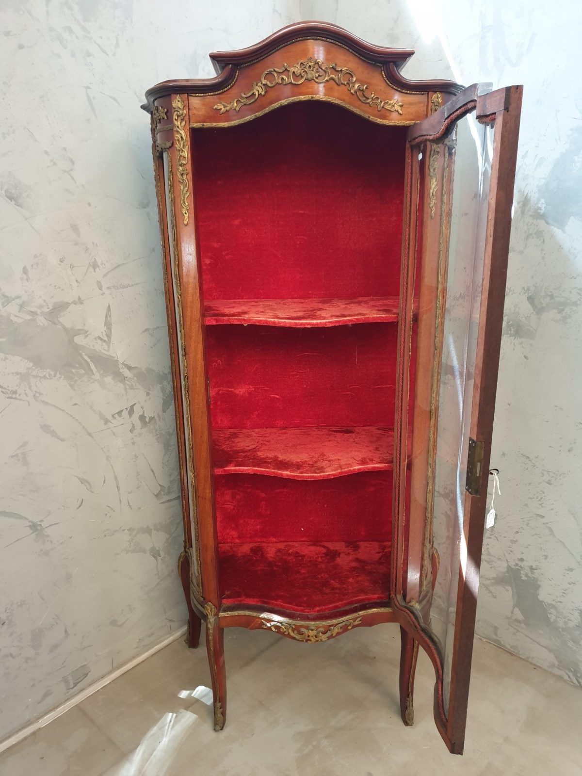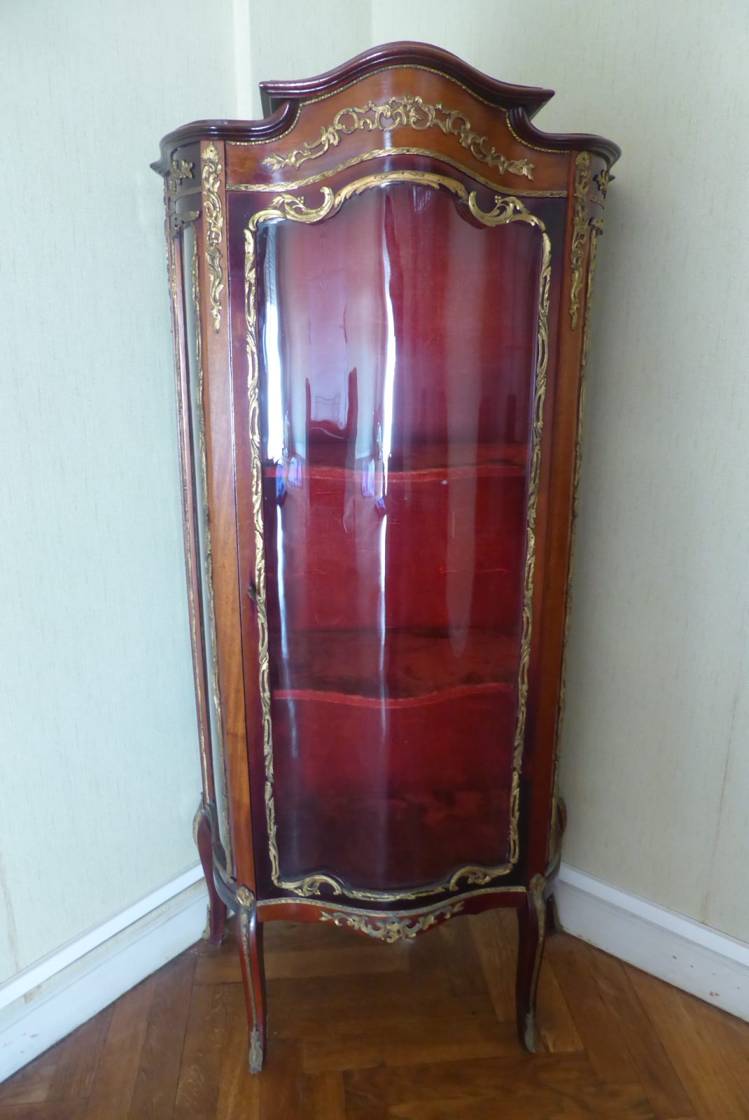 Vitrine de style Napoléon III bombée, à vitre galbée, placage acajou et décors de bronze, ouverture de la porte par la droite, clés fournis H146 x L68 x P33