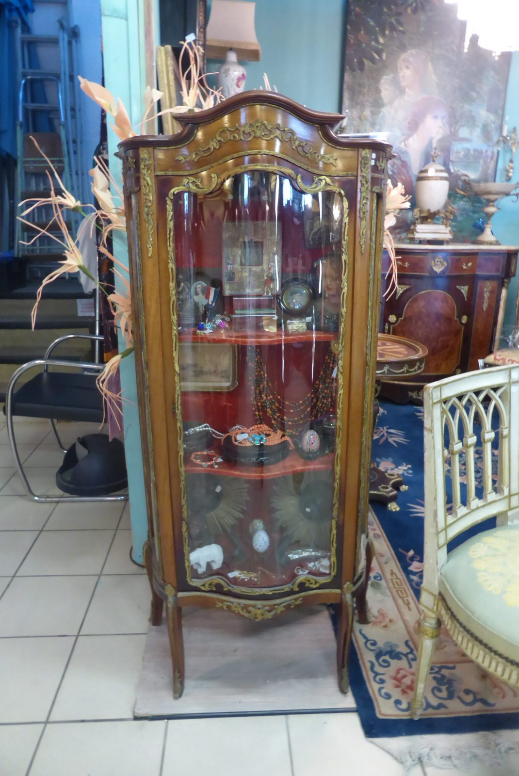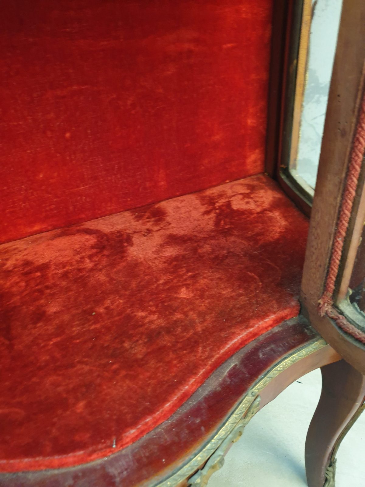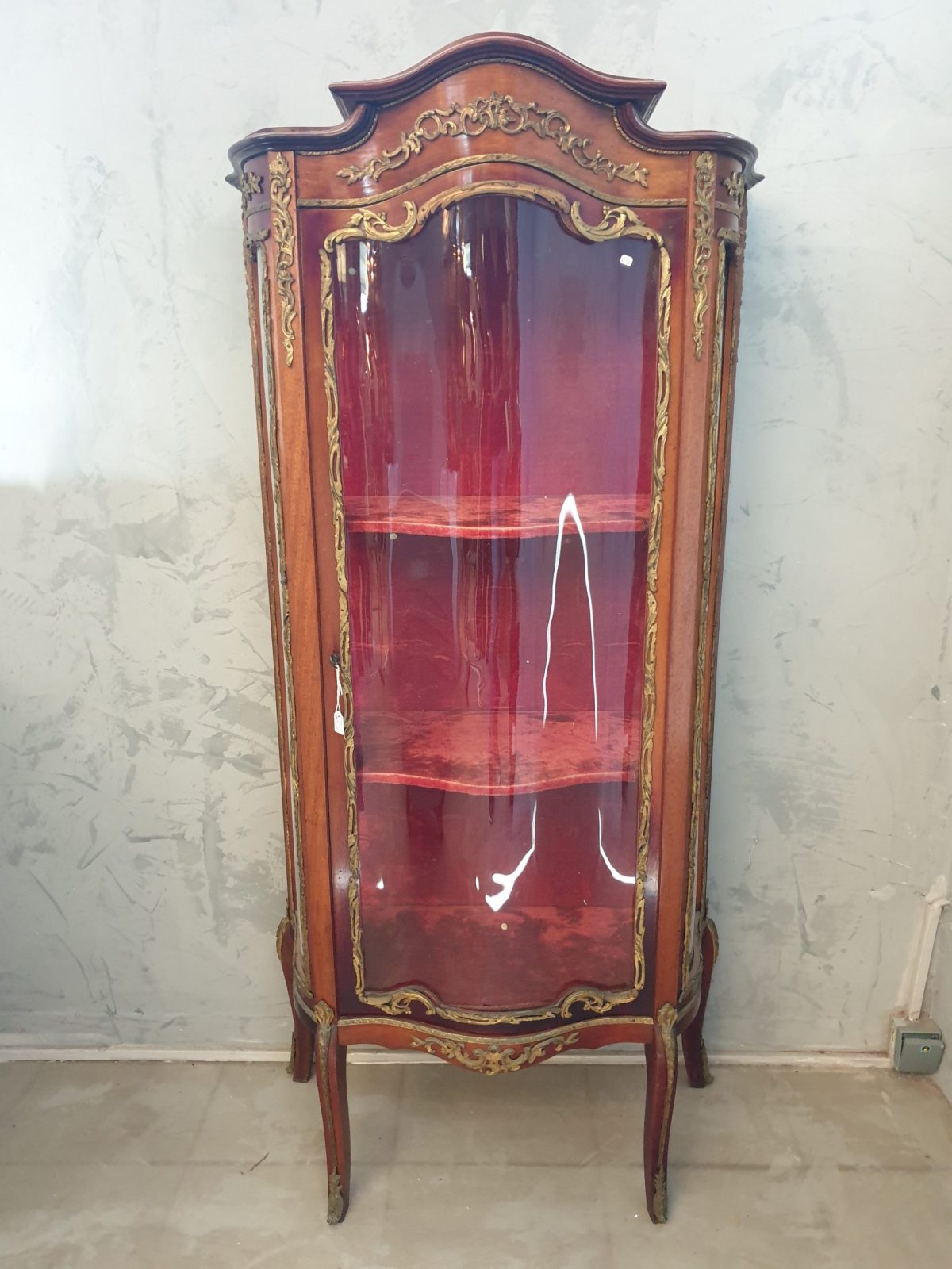 Vitrine de style Napoléon III bombée, à vitre galbée, placage acajou et décors de bronze, ouverture de la porte par la droite, clés fournis H146 x L68 x P33
