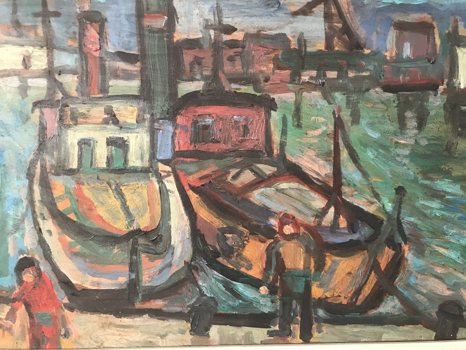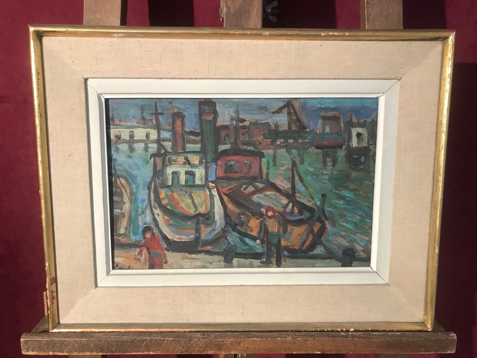 Tableau Huile s Isorel – (Port avec deux barges) H21 x L31 – cadre H33 x L44