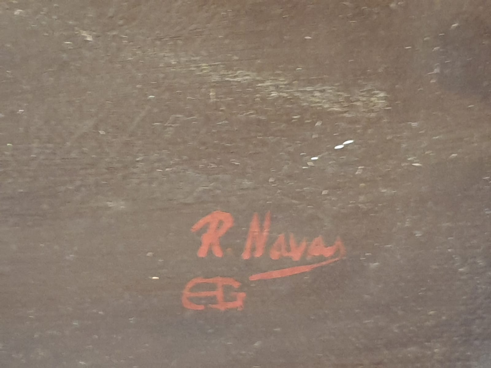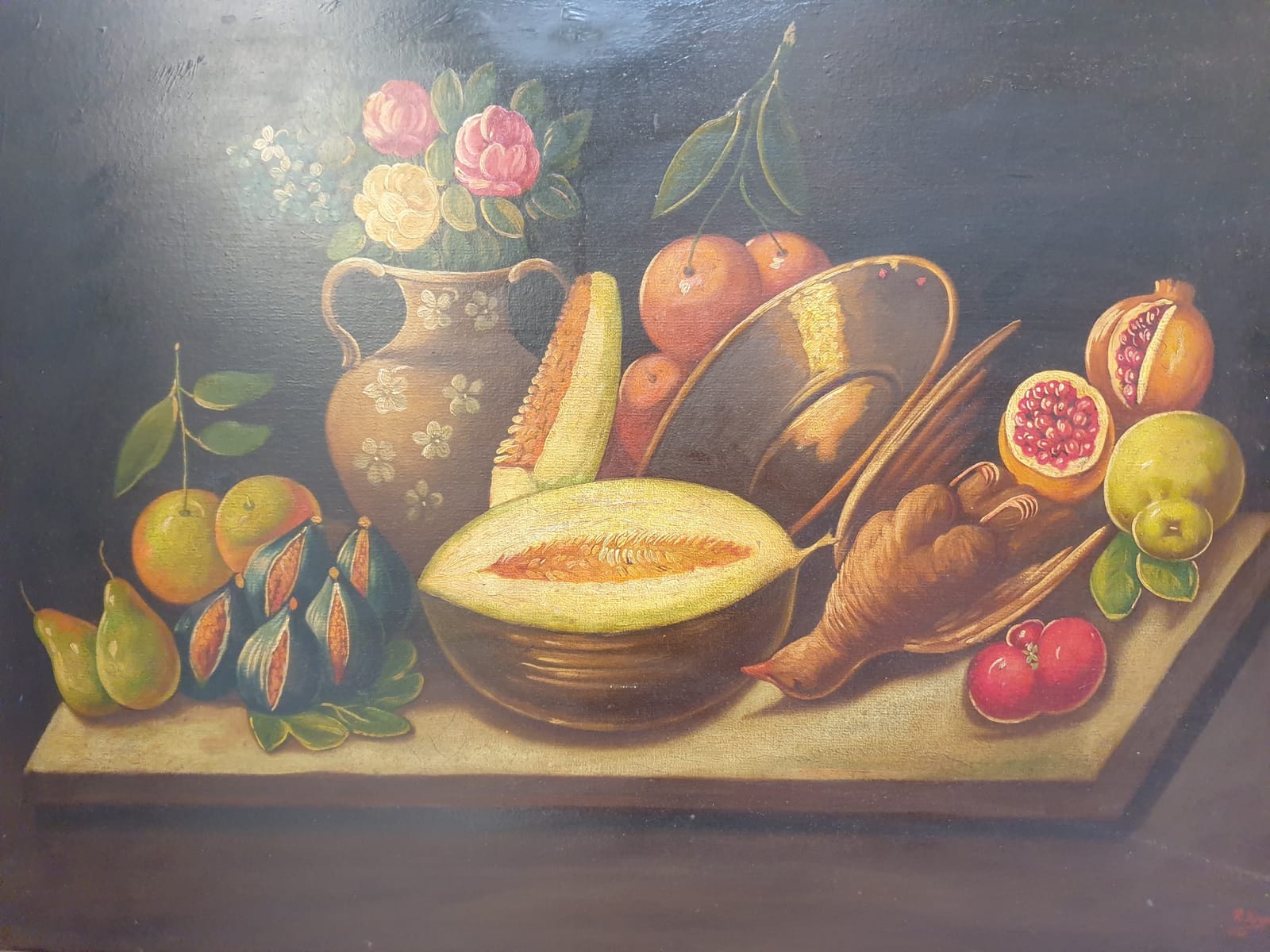 Huile sur toile – (Plateau avec fruit – fleurs et pigoen) signé R Navas – H60 x L81 – cadre H70.5 x L92